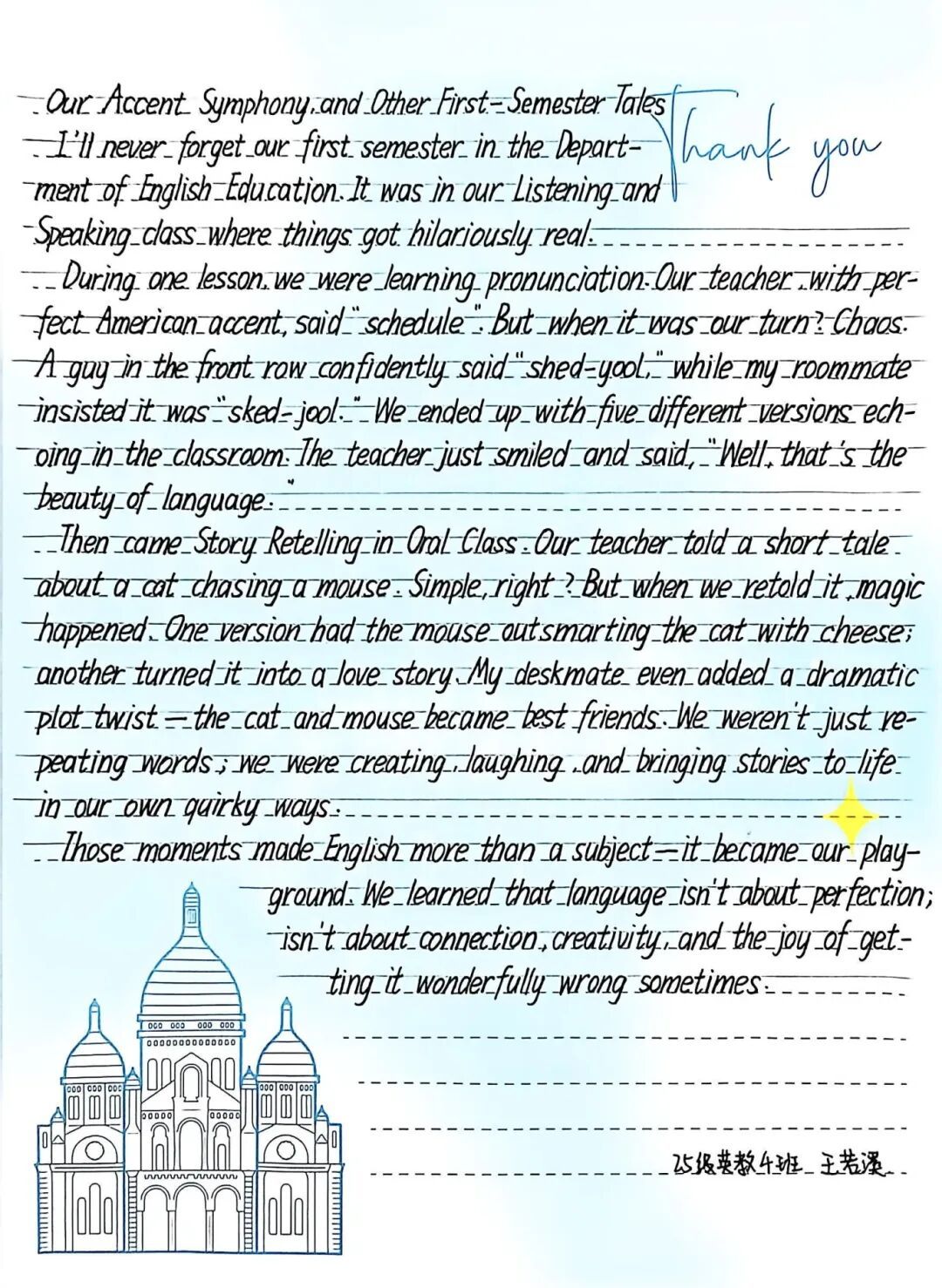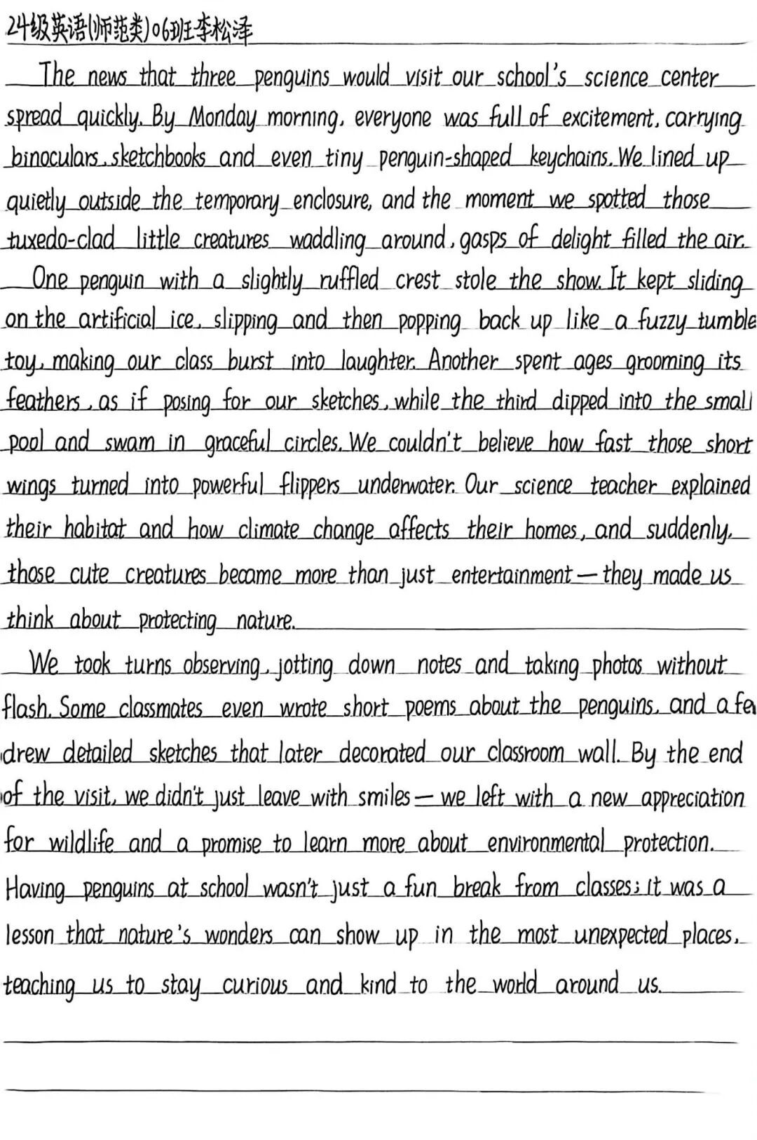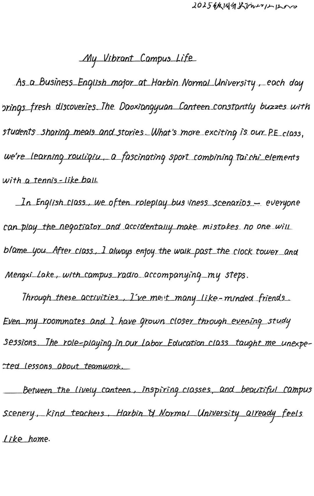 未来,愿我们依然保持对文字的敏感与热爱:当晨光漫过教学楼的窗棂时,愿你有提笔记录的冲动;当食堂的香气裹着笑语飘来时,愿你有想用外语定格的心意;当社团活动的欢呼点亮黄昏时,愿你有将这份热烈写进字符的向往。让外语写作成为陪伴我们校园生活的“老朋友”,用不同的语言,书写属于我们的青春故事。