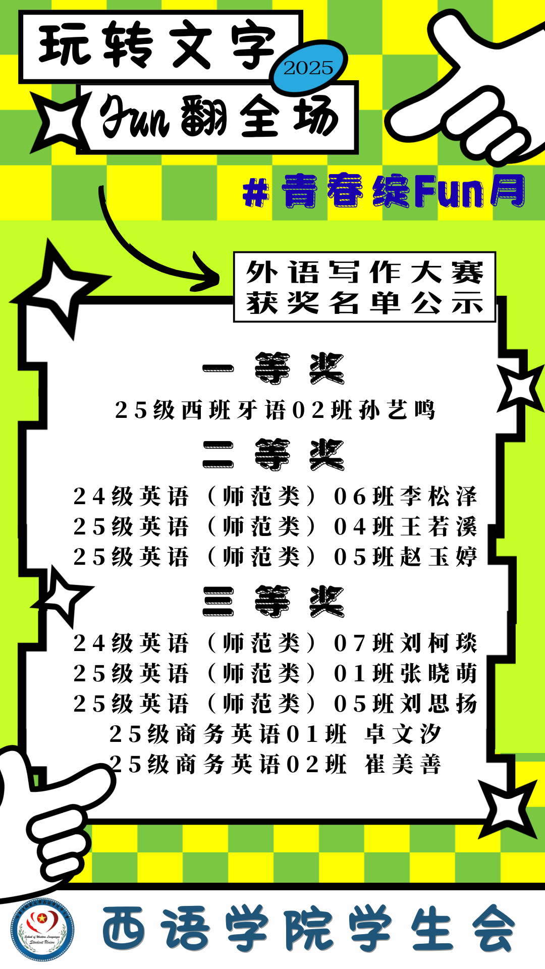 经过多轮细致评审,那些藏在字符里的巧思与温情,终于有了属于它们的回响。今天,我们怀着欣喜的心情,正式公布“玩转文字,Fun翻全场!”外文写作比赛的获奖名单,让这些闪耀着创意的作品,被更多人看见、欣赏与喜爱。