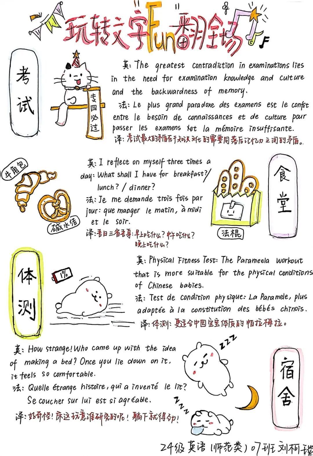 当笔尖与校园趣事相遇,当外文与生活温度碰撞,我们曾收到无数份满含创意的文字答卷——有人用英语记录食堂窗口的烟火气,有人以法语描绘课堂上的幽默瞬间,有人借西班牙语书写社团活动的热烈时光。这些文字,是对校园日常的细腻捕捉,更是对外文表达的浪漫诠释。