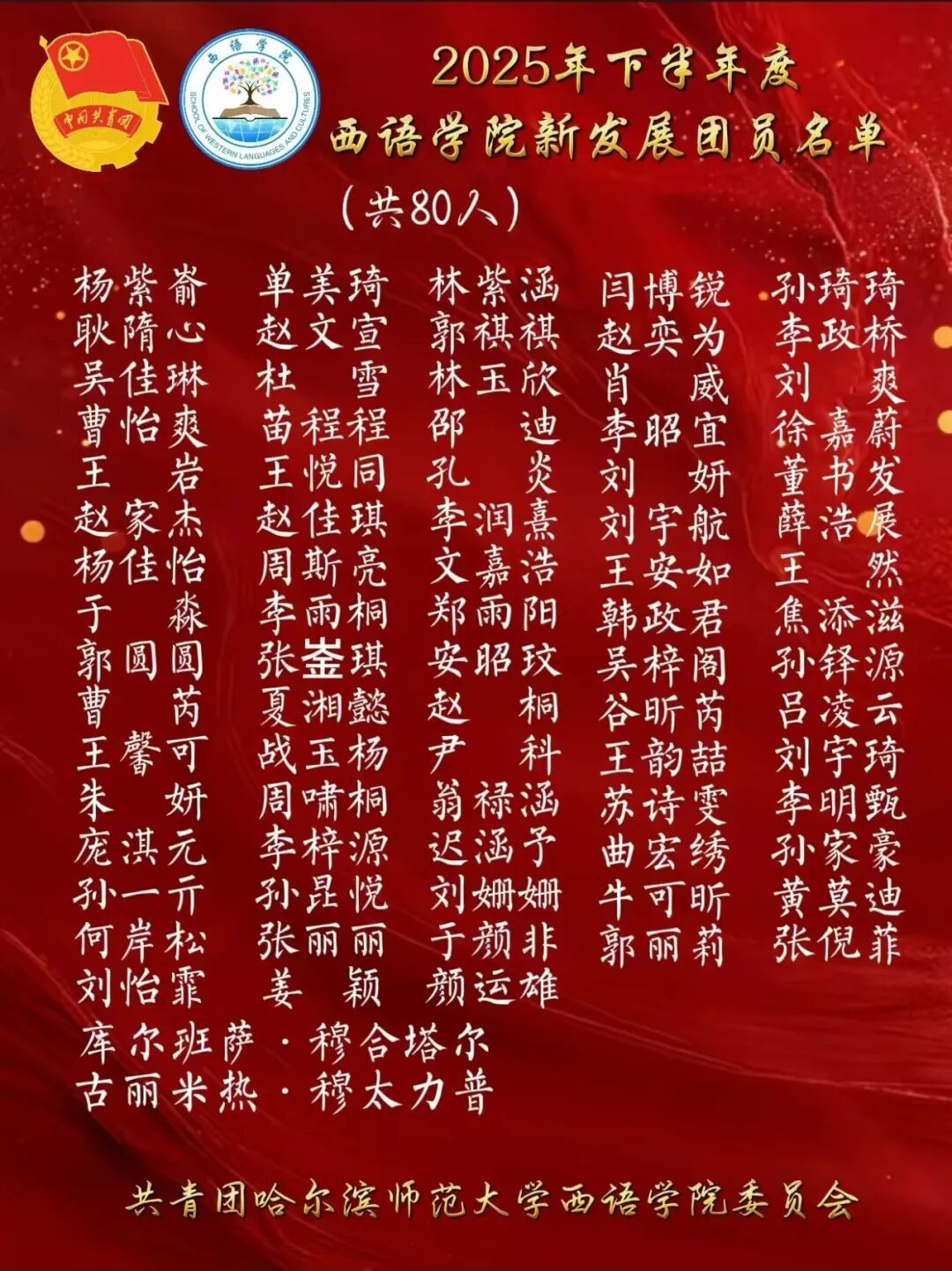 根据《中国共产主义青年团章程》有关规定,经各团支部评议推荐,我院团委严格审核,以下80名同学为本次新发展团员: