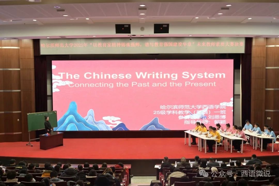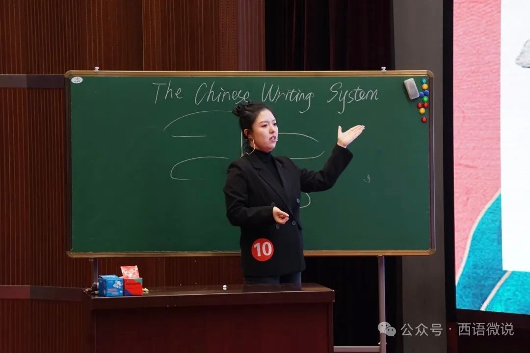 决赛现场的高光时刻,是厚积薄发的必然。刘思博以《The Chinese Writing System》为题,用跨文化视角拆解汉字魅力,将深厚的语言知识与丰富的文化底蕴融入教学的每一个细节——她对教学内容进行了深入的挖掘,以沉着的风度、流畅的叙述和精巧的设计布局独树一帜。