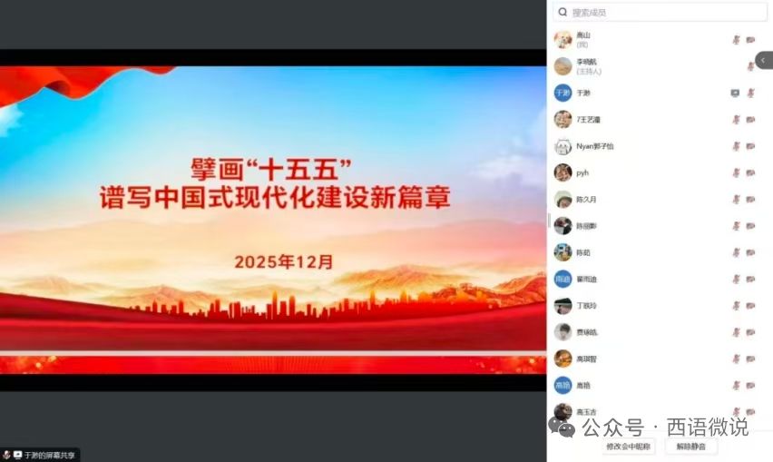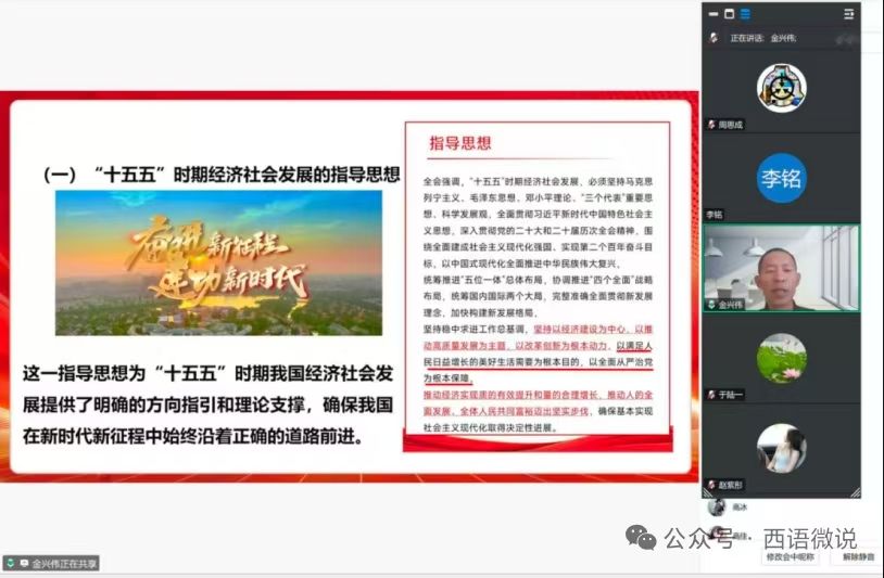 举办学习贯彻党的二十届四中全会精神线上专题宣讲报告会,我校党的二十届四中全会精神宣讲团成员、马克思主义学院副教授金兴伟作《擘画“十五五”谱写中国式现代化建设新篇章》的专题宣讲,师生党员代表参加宣讲活动,学院党委书记李晓航主持会议。