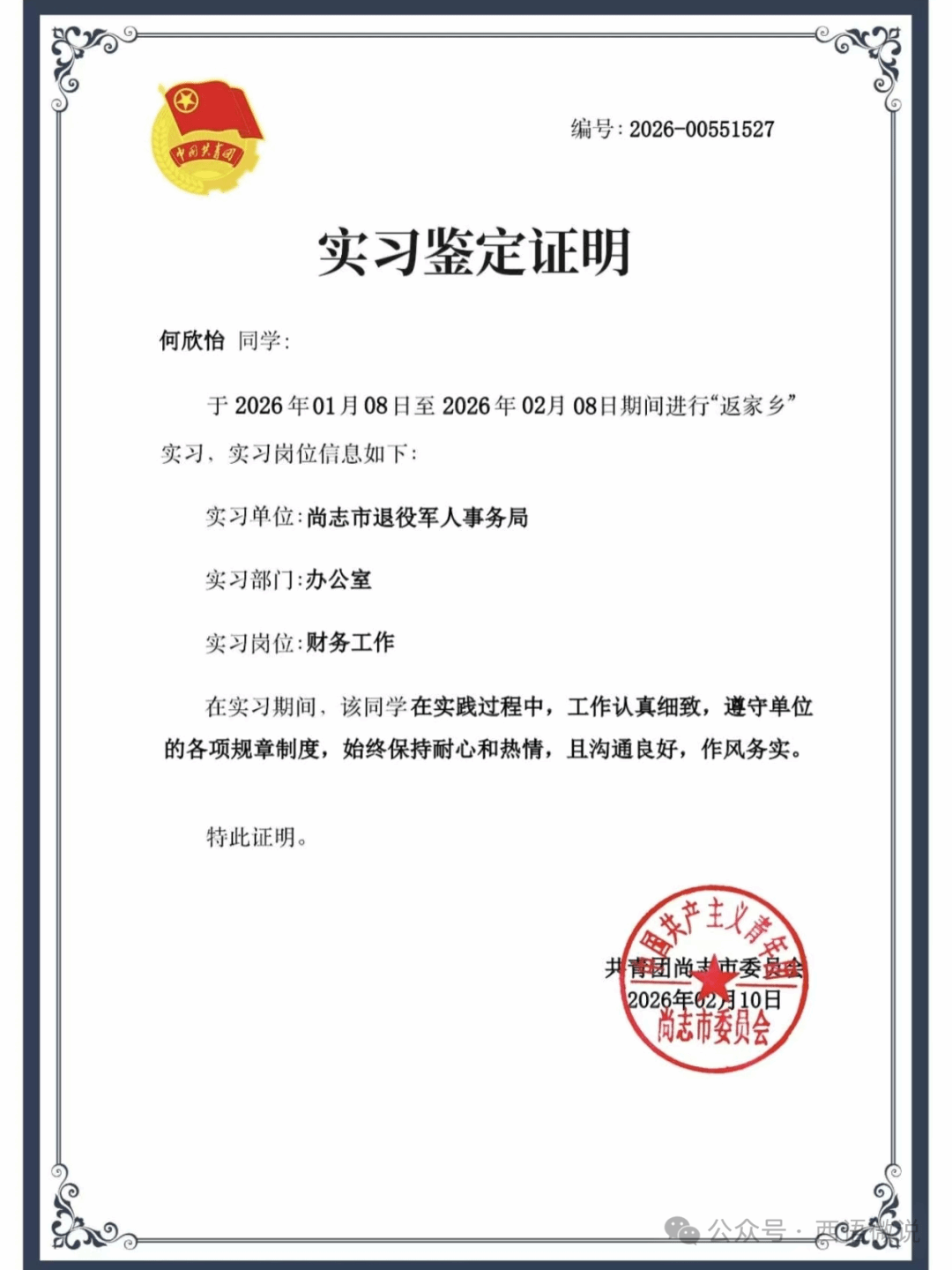 2026年1月8日至2月8日,2025级英语师范专业8班何欣怡进入尚志市退役军人事务局财务岗实习。在做好退役军人服务保障工作的同时,她获评“哈尔滨冰雪推介官”。她不仅参与英烈纪念碑祭扫活动,在缅怀先烈中汲取红色奋进力量,还积极挖掘家乡冰雪文旅资源开展宣传推广,在政务服务与家乡推介的双重实践中,展现了新时代青年的青春担当。
