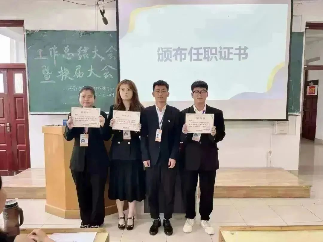 随后,进入任职证书颁发环节。首先由指导老师徐伟伟为主席团成员颁发任职证书,随后由主席团为各部门原部长副部长颁发任职证书。