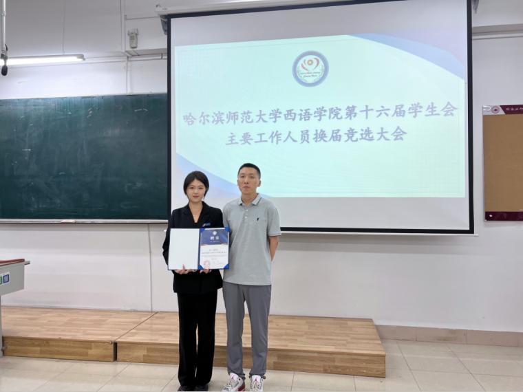 第十六届学生会名誉主席称号,这不仅是对由卓尔同学工作能力的认可,也是学生会与她点点滴滴的见证,学生会指导老师翟雪男为其颁发证书。