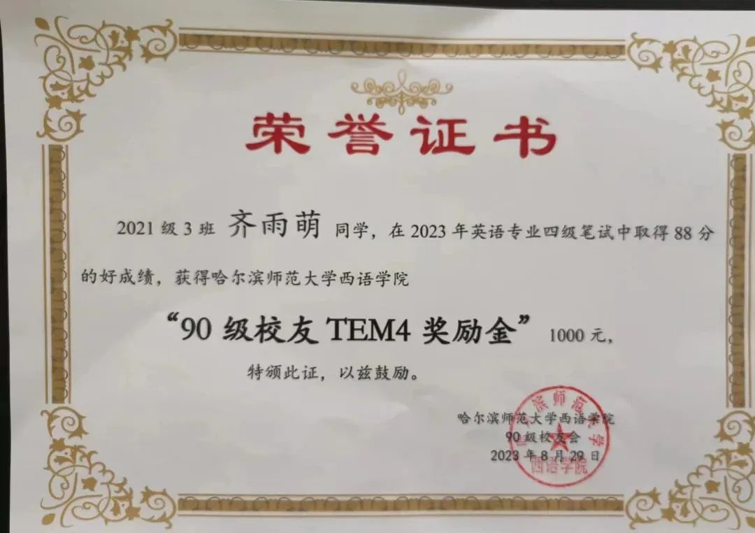 在2023年英语专业四级笔试中,2021级英语专业3班齐雨萌同学以88分的优秀成绩获得学院2021级第一名,荣获 “90级校友TEM4奖励金”1000元,由iqqtv