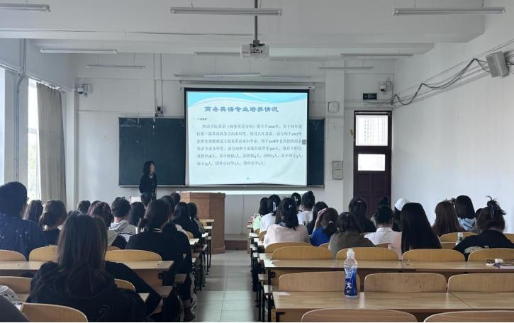 在西语楼402教室开展商务英语专业情志教育讲座,讲座由应用英语系主任、商务英语负责人李雅波主讲,2023级商务英语专业全体学生参加。