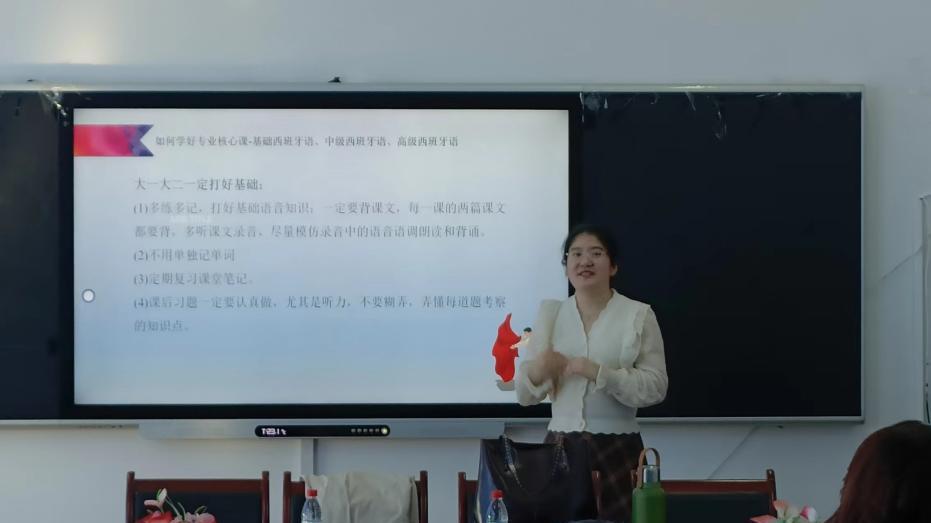 第二,关于学习。魏晓鑫给同学们分享了关于西班牙语学习的一些公众号和软件,介绍了如何充分利用这些学习助手在学习、生活、考研、就业等方面获得帮助。对在不同阶段要学习的专业核心课程从听、说、读、写四个方面也进行了解读。