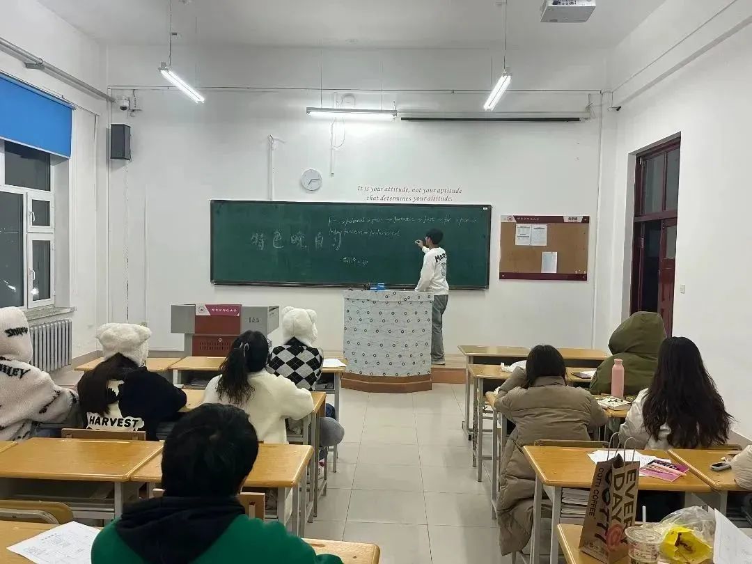 本次活动面向2023级全体同学,地点是各班教室,活动宗旨为通过开展本次特色晚自习活动,有效提高同学们的外语口语水平,加强同学们之间的交流互动,促进班级同学之间的合作与共同发展,进而提高班级的凝聚力和活力。以此使2023级学生明确经济社会发展的意义及追求丰富校园文化生活的重要性。