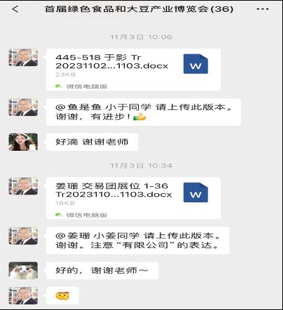 我非常荣幸能够参与此次绿博会的翻译任务,让我有机会在实践中学习和提升自己的翻译技能。在这次任务中,我负责的是部分交易团展位的审核工作,老师会在我们翻译之前给出建议,也会在我们提交翻译文本后及时给出指导,这让我明确了一些专业术语的英语翻译和更地道的英语搭配。