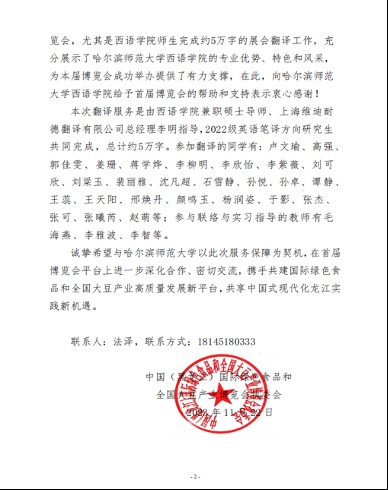 2022级MTI师生圆满完成展会翻译项目,收到黑龙江省国际博览发展促进中心的好评及感谢函。