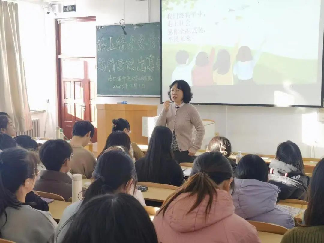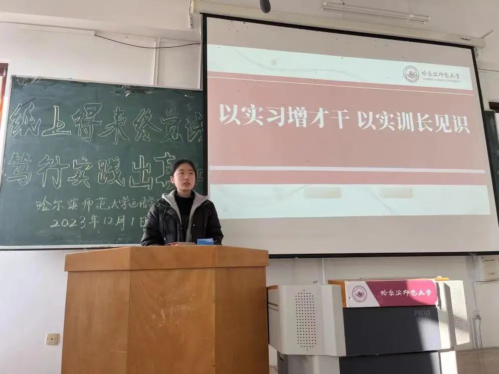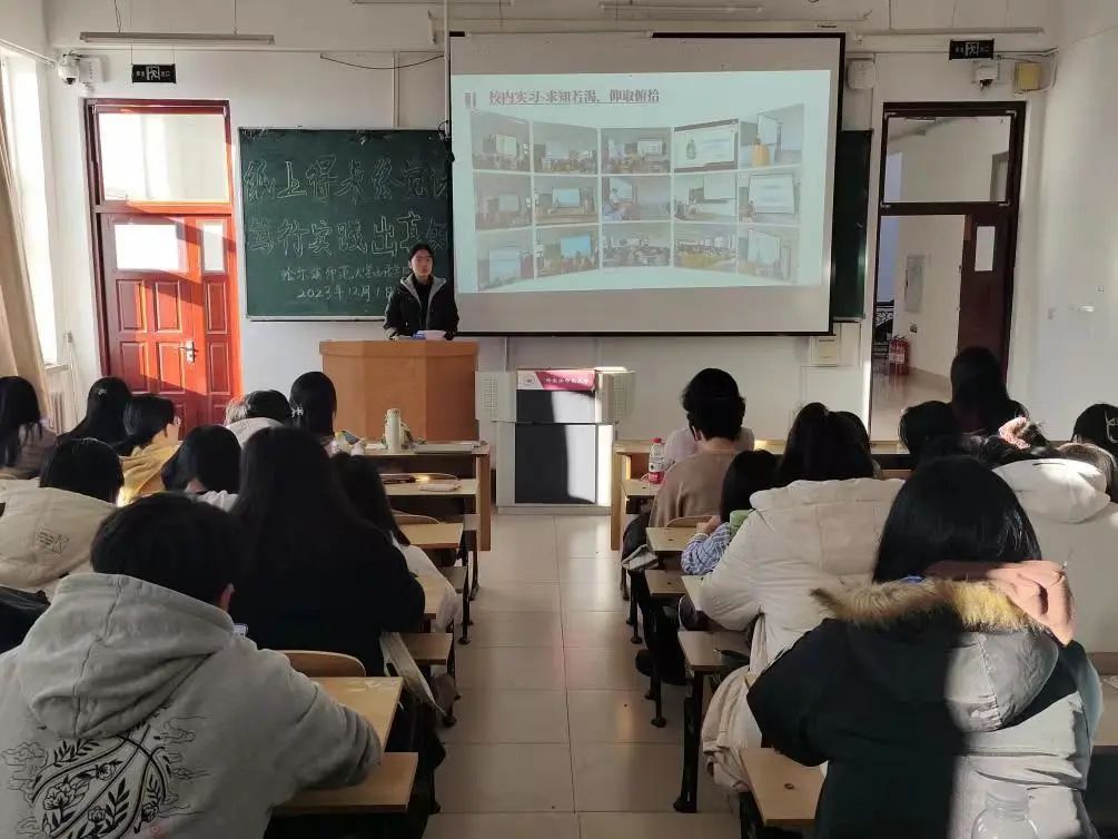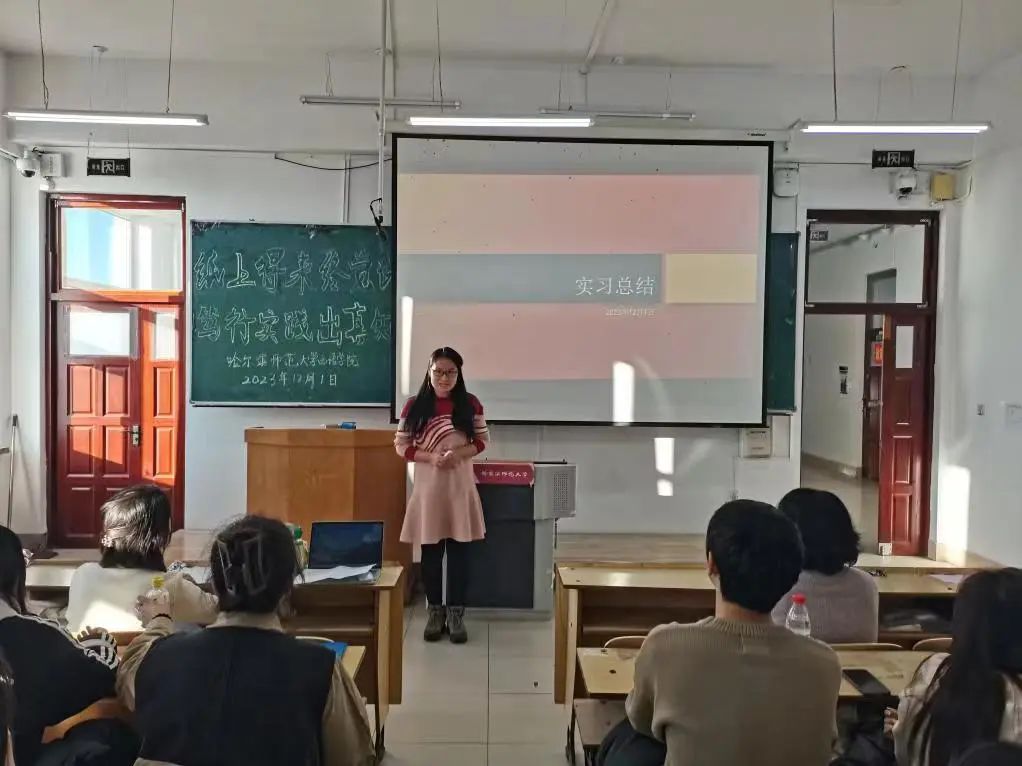 然后,实习指导教师代表丁昳玲老师分别展示了校内实习和校外实习两个不同阶段各个实习基地的教师指导和学生实习情况。她指出,14场校内培训讲座是集学院领导和各位指导老师之力,由本校老师和实习基地专家共同完成,为本届实习生提供了非常宝贵的学习机会,让学生能够在知识和技能双方面得到提升,学生们都有很大收获。丁老师用一张张照片将同学们的回忆拉回到了实习的第一天,展示了同学们在公司的工作日常和实习成果,记录了同学们的飞速成长。她还提到许多实习基地对我系实习生们的态度和表现给予了高度肯定。通过丁老师生动详实的汇报,2021级同学们也对未来的实习状况有了大体上的认识与了解。最后,丁老师激励同学们勇敢走出象牙塔,积极走进社会实训大课堂,对未来充满希望!