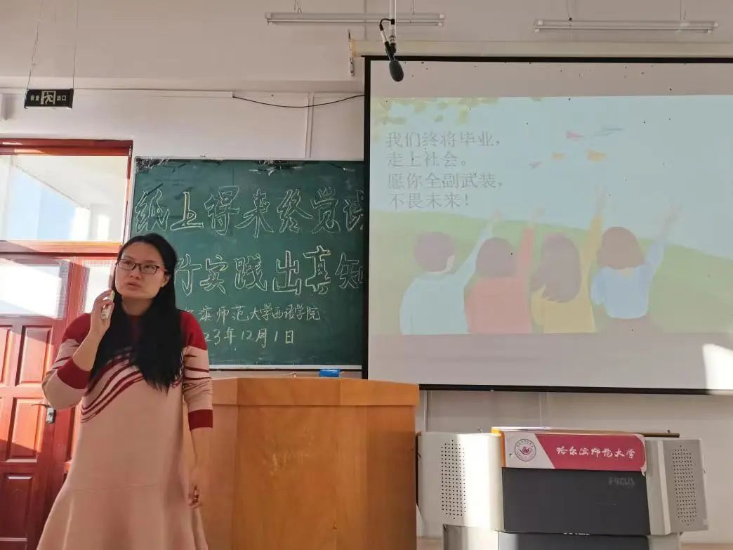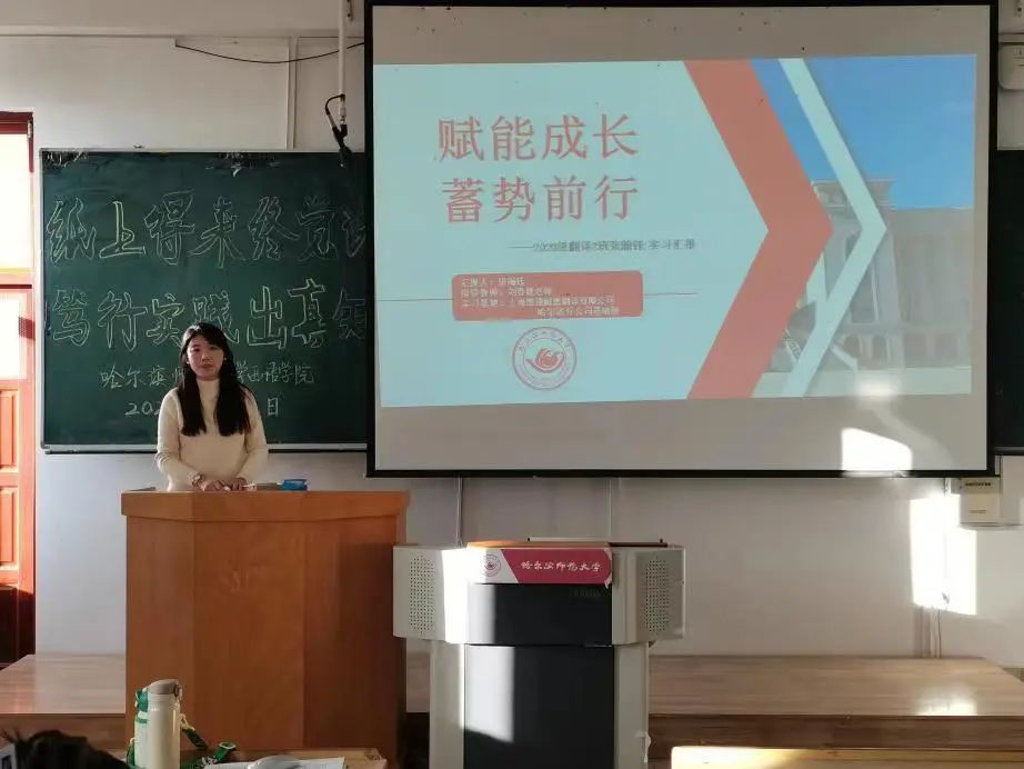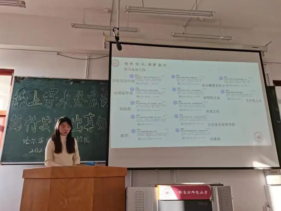 2020级翻译专业实习生代表张瀚钰介绍了其在上海维迪耐德翻译有限公司哈尔滨分公司基础部的工作日程。她在实习中学习了邮件、证明证件类、法律类文本、公示语及说明书类文本、传统文化类文本和文学类文本等不同类型文本翻译的注意事项和分析思路,并着手进行了大量的翻译工作。并在翻译实践中总结出了以下要点:摆脱中式英语,尊重文化差异,以及保持语言美感。