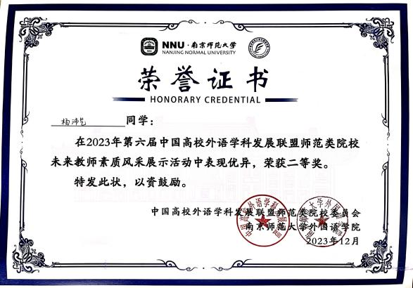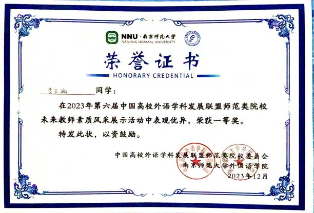 为全面提升师范类院校学生英语教学技能和教学水平,推动未来卓越英语教师综合素养的培养,发挥职前教师教育的引领示范作用,同时促进师范院校英语专业的交流,中国高校外语学科发展联盟主办,南京师范大学承办了“第六届中国高校外语学科发展联盟师范类院校未来教师素质风采展示活动”,于2023年12月2日圆满落幕。我院白丹和张洋两位老师共同指导的21级学生李玉涵同学荣获一等奖、杨沛艺同学荣获二等奖。