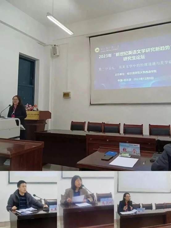 分论坛(二)“英语文学中的伦理道德与美学研究”由张莹教授主持,张莹教授、刘英昕教授、高文婧博士评议。本组聚焦于外国文学文本中的伦理问题与审美价值。上半场罗倩从文学伦理学批评视角,分析《玻璃城堡》的伦理困境与教诲;汪晓彤运用原型批评理论,分析《双城记》与《太古和其他时间》中共同意象原型,反思人类生存危机;王昊泽通过创伤理论,探索《奇幻山谷》中母亲的身份迷失、建构书写和伦理治愈;陶佳琪通过文本细读,对《西方正典》中关于莎翁影响力的内容进行高度总结、提炼、反思以及评论;孟庆新探索《最蓝的眼睛》中的创伤书写,并反思少数裔群体如何避免创伤、走向治愈;瞿魏娟运用文学伦理学批评分析《赵氏家族》,探索故事中“弑父”主题背后的伦理启迪和教诲。下半场李想从美与丑的二元关系,剖析《枯叟》丑陋刻画背后蕴藏的美好品质启迪;李佰佳跨媒介地运用“镜子说”理论,分析莎翁十四行诗中镜子意象折射出的真善美教诲;李婷婷从伽达默尔前见理论视角分析莎翁《哈姆雷特》傅光明,朱生豪两位译者各自的译文魅力;杜非着眼于莎翁十四行诗中的多维影响,探索意象背后的伦理教诲与审美价值;王雪通过分析《麦克白》中光之意象,挖掘“光”与“暗”的起伏下莎剧的教诲和启迪;赵一迪提炼《西方正典》中的“误读”书写,再证莎士比亚的文学经典地位。