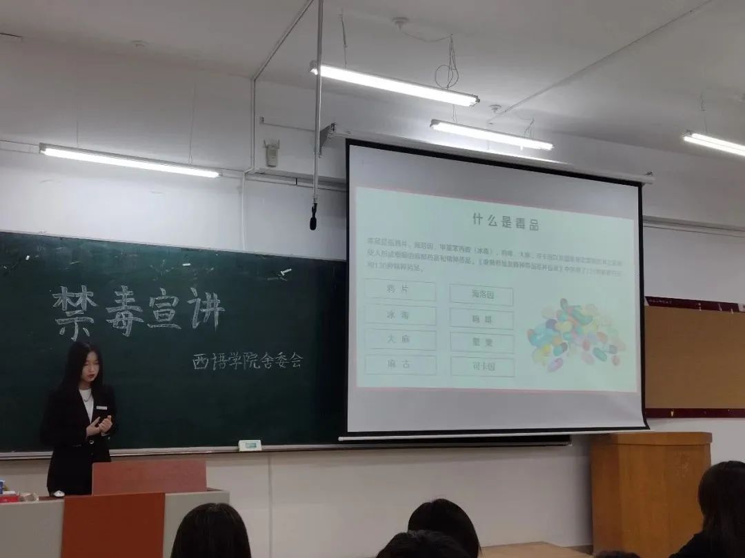 活动伊始,在场的工作人员先是向同学们普及毒品知识。从毒品的定义到层出不穷的新兴毒品种类、毒品的危害、如何甄别毒品、预防毒品的方法、沾染毒品后的措施等多个方面,宣讲人员为同学们做了认真详细的介绍。