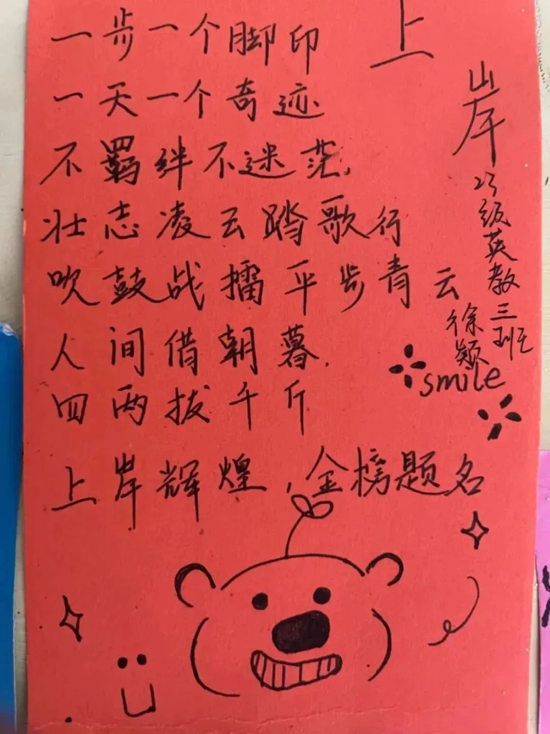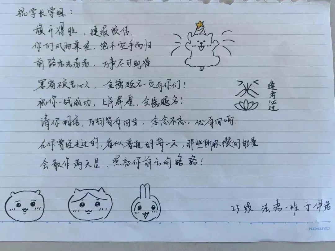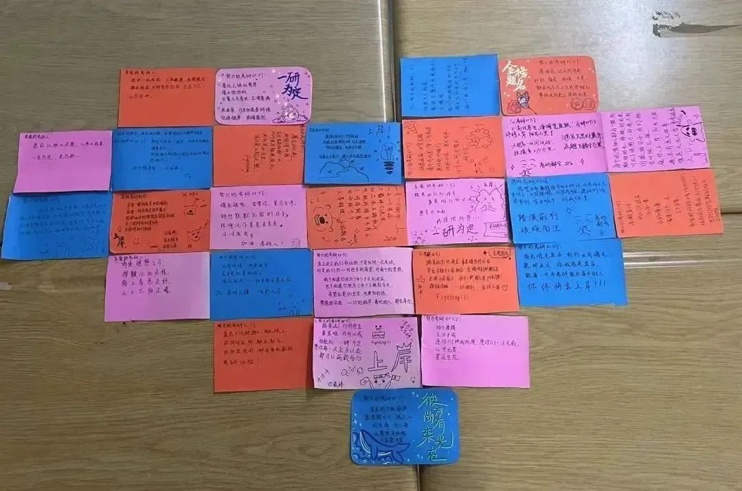 “星光不负赶路人,时光不负有心人”、“春风得意马蹄疾,一日看尽长安花”、“追风赶月莫停留,平芜尽处是春山”……一张张留有温度的卡片上的祝福寄语,书写着同学们对备考学子的诚挚祝福。