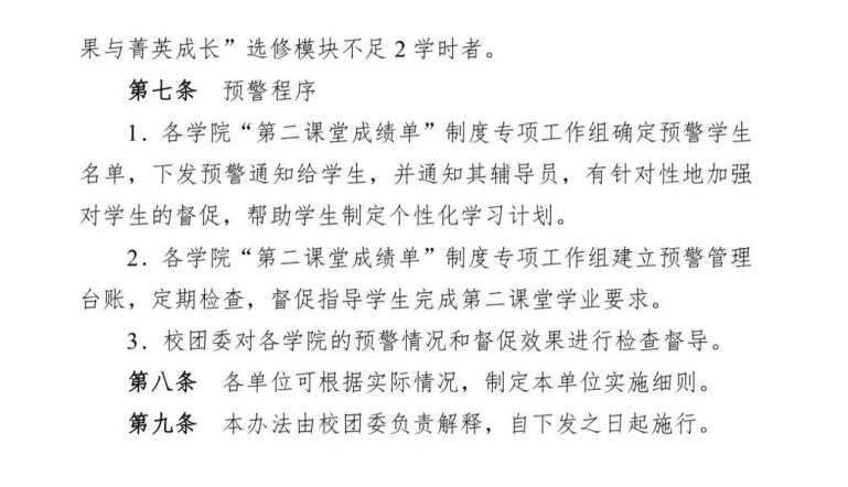 团委将此次改革相关信息下发各班团支书,并要求各班团支书传达信息并确保落实到每位同学,让同学们熟知学分发放的各项条件以及预警管理办法,提高同学们对于学分的重视度。