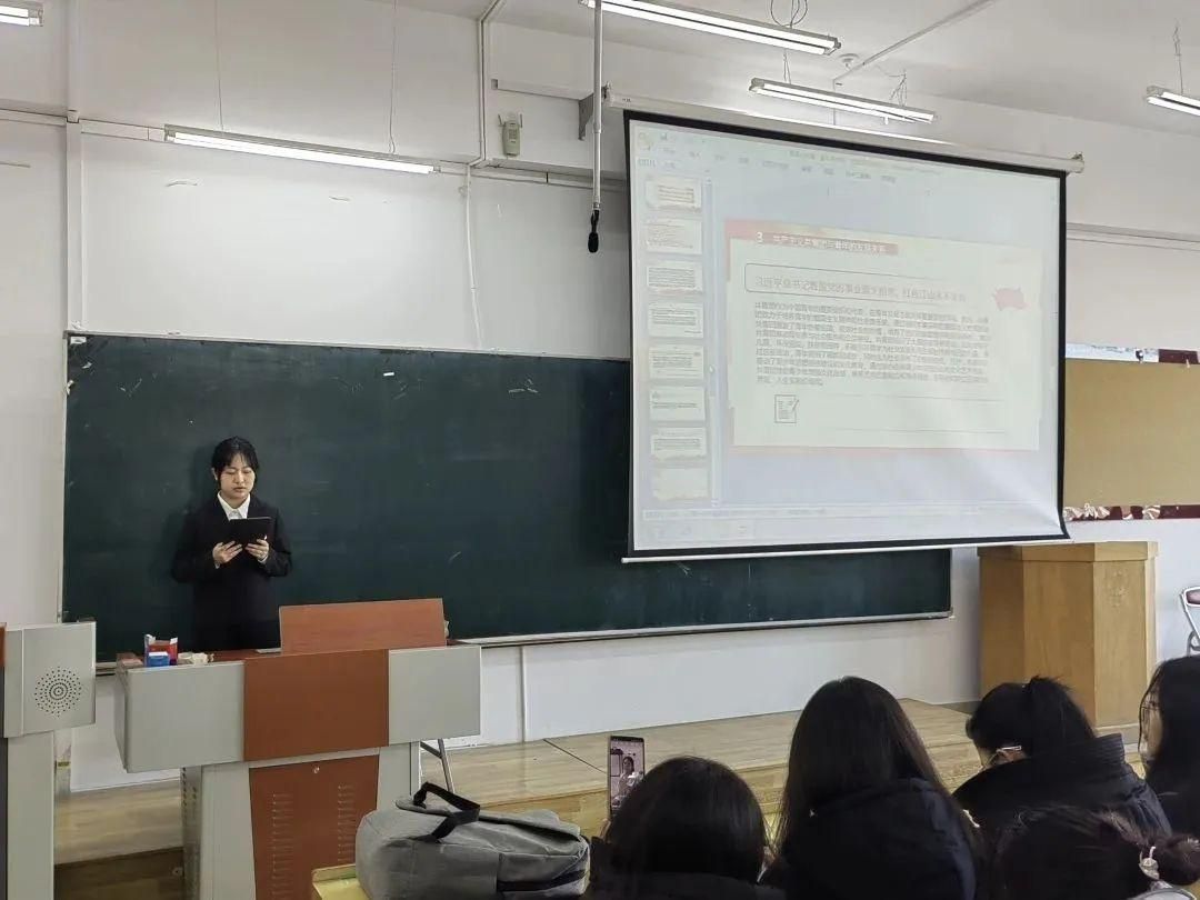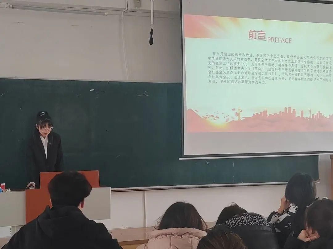 在第一期主题团日活动中,主讲人孟凡琳首先对理论知识方面进行介绍,如共产主义共青团的历史与定位、主要任务和奋斗目标、共青团与青年发展的关系。接着主讲人邀请同学们表达自己对新时代青年的奋斗目标的见解,同学们各抒己见、集思广益,铿锵有力地表达自己的观点。大家纷纷表示作为新时代的新青年,我们要与时俱进,紧跟时代的步伐,不断解放思想,开拓进取。其中一位同学强提出青年应努力奋斗,不断前进,毫不畏惧一切艰难险阻。当主讲人谈到理想时,又有同学提出我们应胸怀远大理想,将个人理想与家国发展紧密结合。主讲人对此做出总结,新时代青年是国家和民族发展的支柱,是祖国的建设者、捍卫者、见证者,是实现中国梦的主要力量。