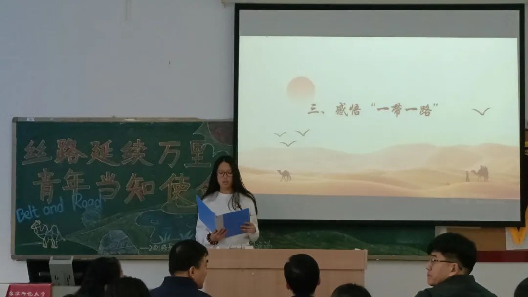 第三部分是“感悟‘一带一路’”。魏梦飞、郭晓睿等同学们在发言中表示,“我们应通过提高自身的英语实力,积极传播中国文化,让世界了解中国,也让自己成为中外文化交流的桥梁。”“作为新时代青年要坚定信念,提升素质,积极创新。以新时代为舞台,以英语为工具,展现自我,实现价值,为祖国的繁荣贡献自己的一份力量!”