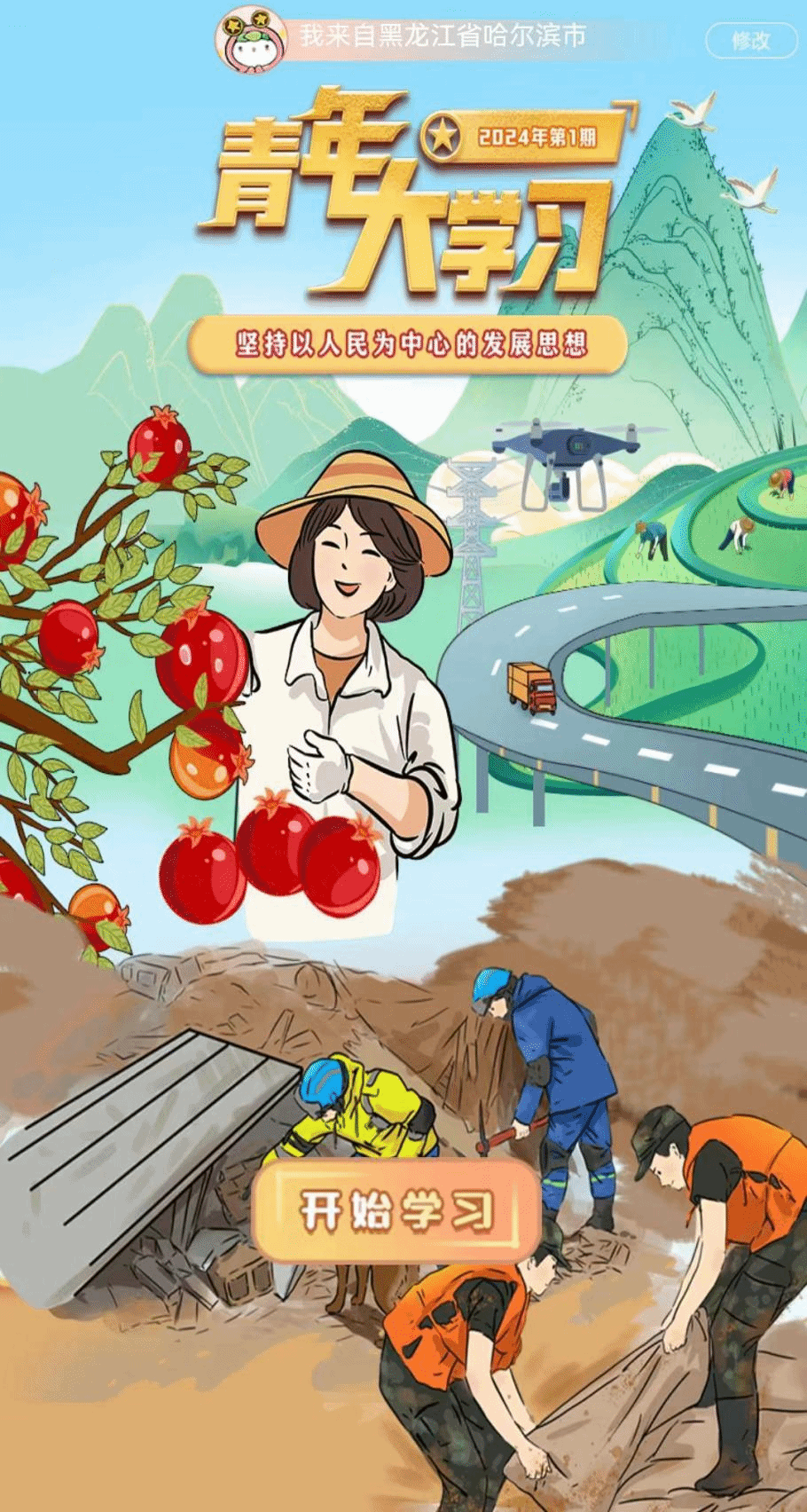 学习党的创新理论,争做新时代好青年。历史车轮滚滚向前,奋斗征程迎来新的一年。在二〇二四年新年贺词中,习近平总书记回望过去一年的步伐,展望新一年的奋斗目标,指出“我们要坚定不移推进中国式现代化”,强调“我们的目标很宏伟,也很朴素,归根到底就是让老百姓过上更好的日子”。铿锵的话语掷地有声、温暖人心,彰显人民至上的价值追求,鼓舞和激励亿万人民踔厉奋发、团结奋斗。