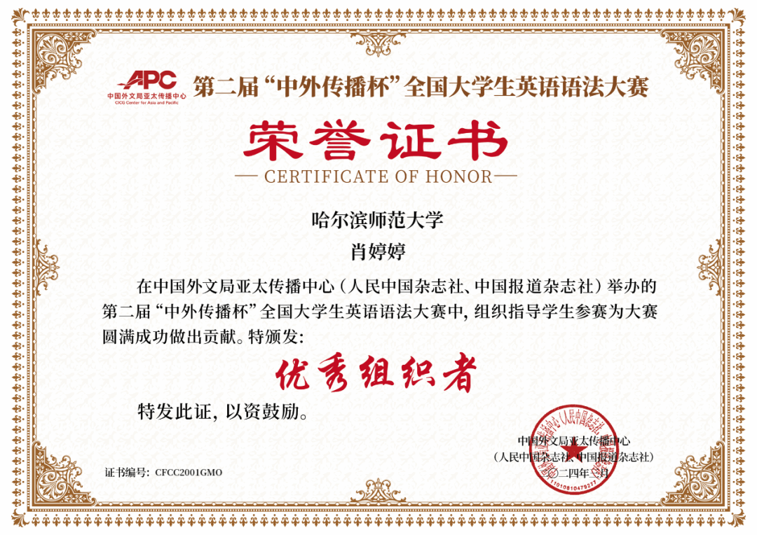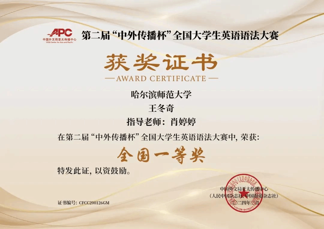 学生们展现了扎实的语法功底和出色的表现,凭借优异的成绩脱颖而出,斩获佳绩。赵紫彤等同学获得全国特等奖,王冬奇、尚志明、王艺诺等同学分别获得全国一、二、三等奖。
