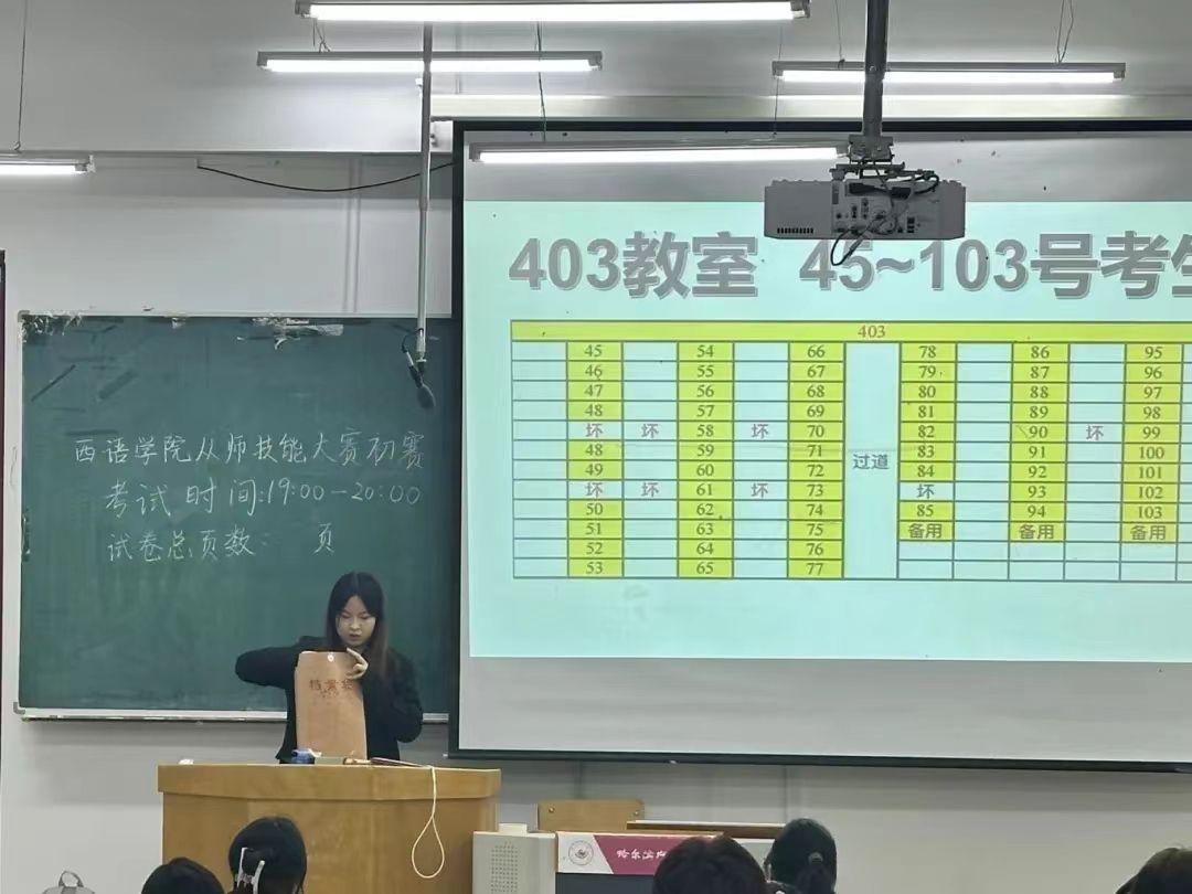 3月14日19:00,参赛选手及工作人员均按时到达指定考场,在完成选手签到、宣读考试细则、展示密封试卷等一系列工作后,本次初赛于19:10在西语楼451、551等九个教室同时展开。参赛选手们精神饱满,笔翰如流,严格遵守考场秩序和比赛规则;监考人员公正严明,尽职尽责,为参赛选手们创造良好的考试环境。