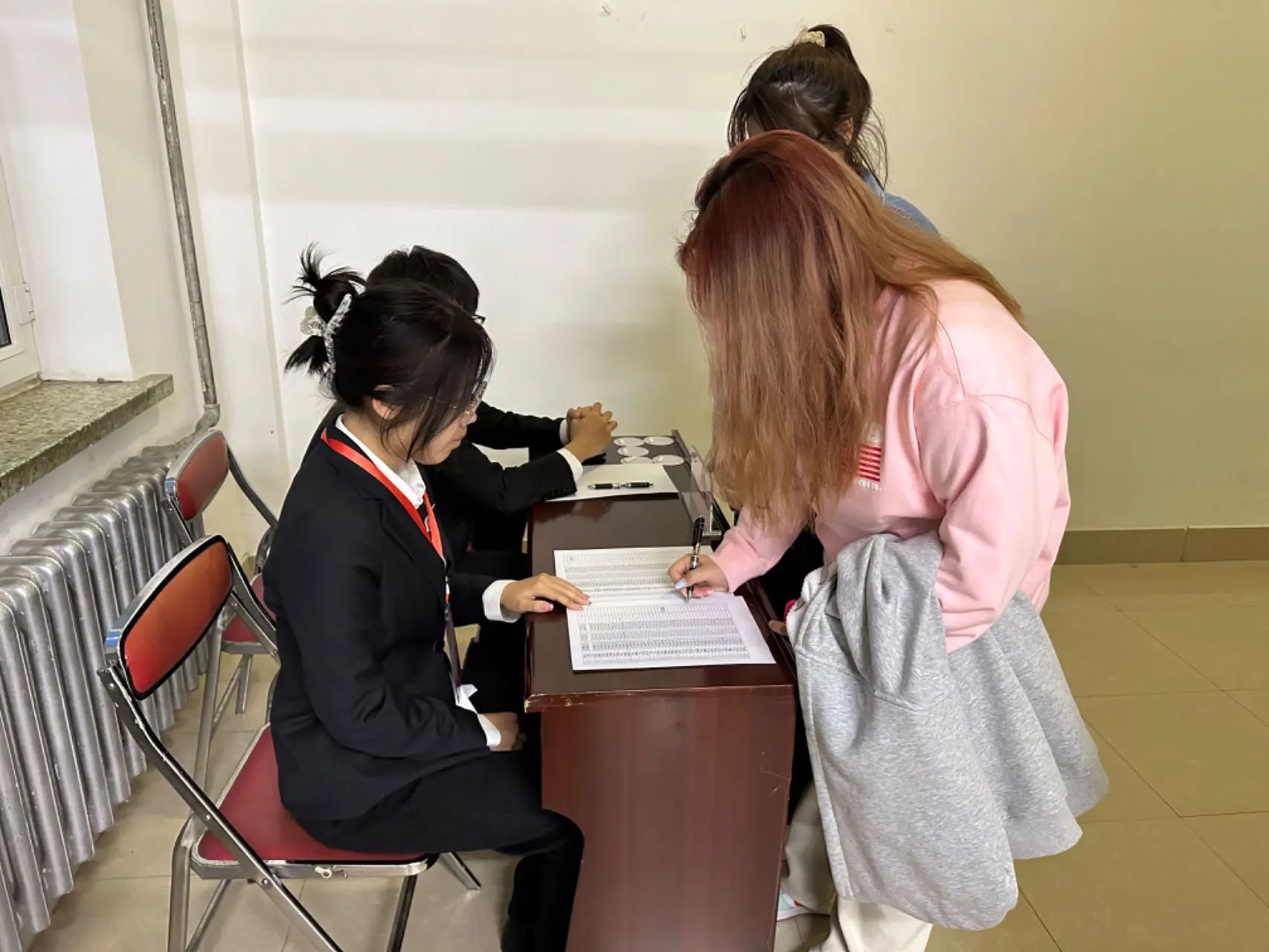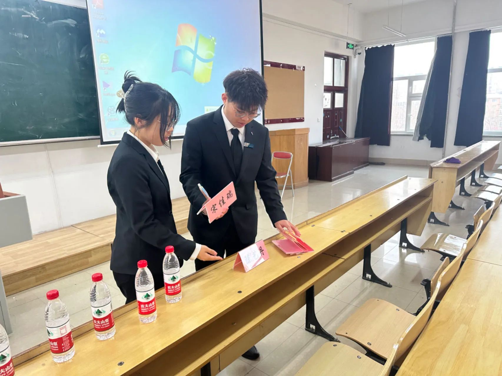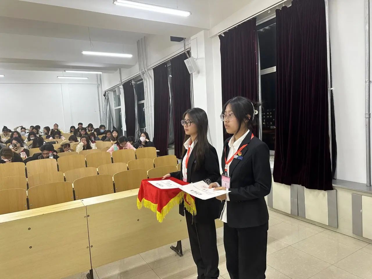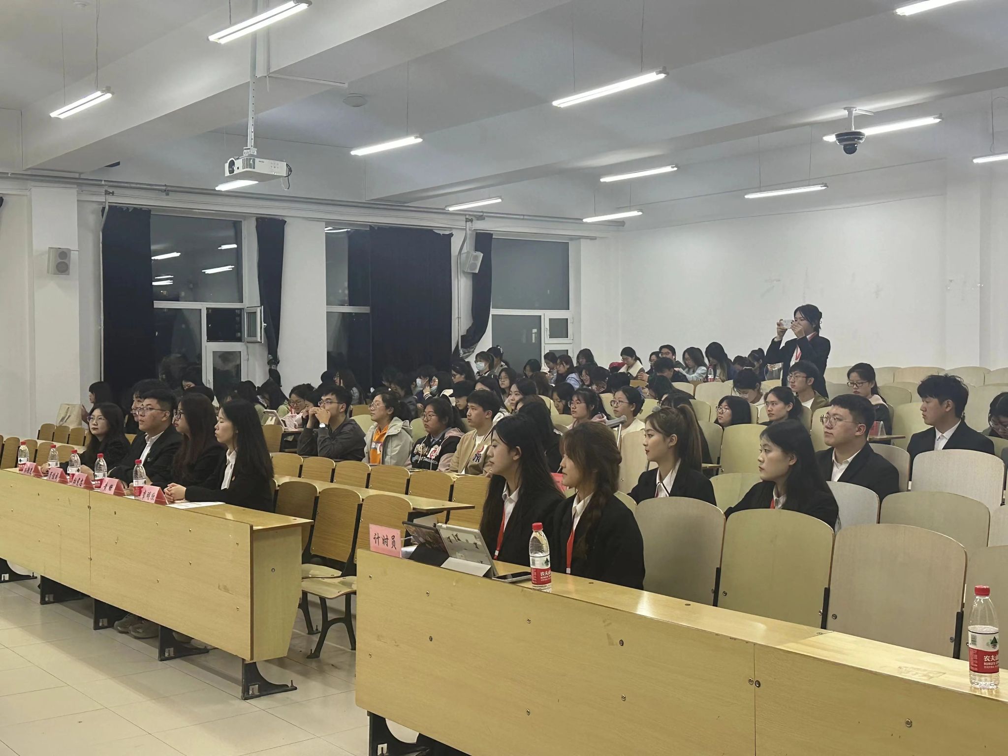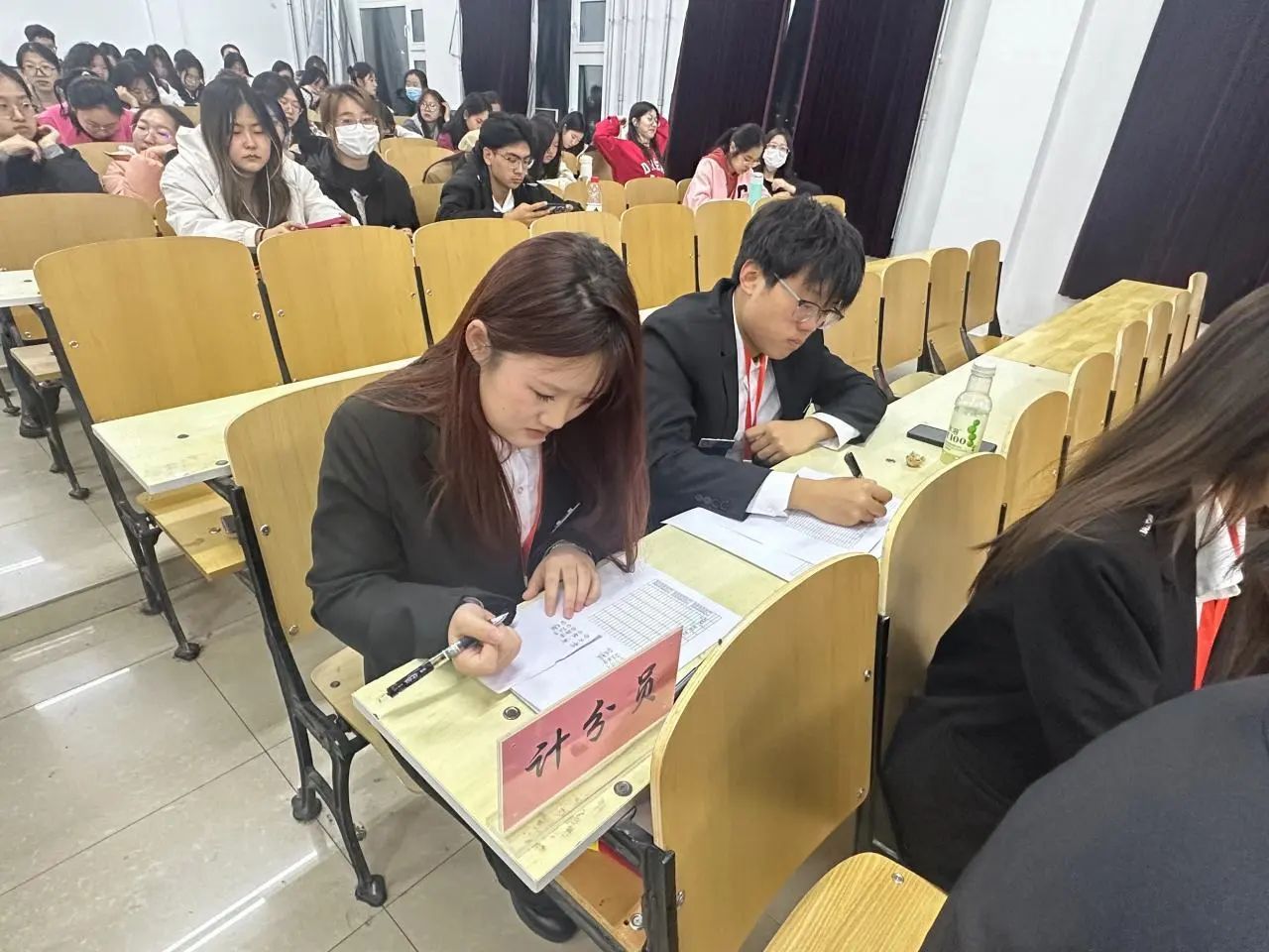 4月11日比赛当天,工作人员提前到达教室进行卫生清扫以及场地布置工作。为保障比赛的相对公平性,选手按照抵达赛场的先后顺序,现场依次抽取序号,并由工作人员引导致相对应的座位,与此同时,观众们也陆续入场。