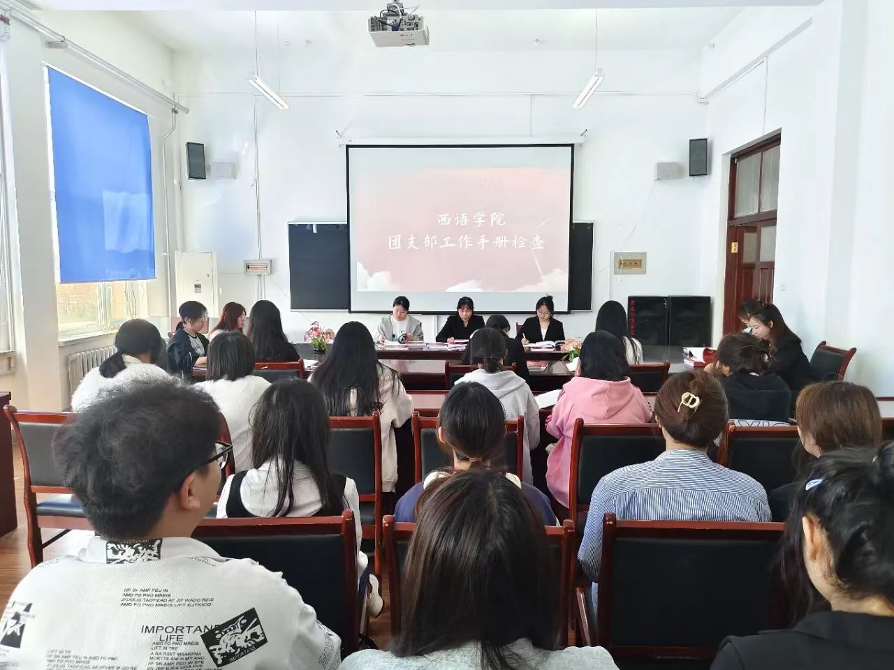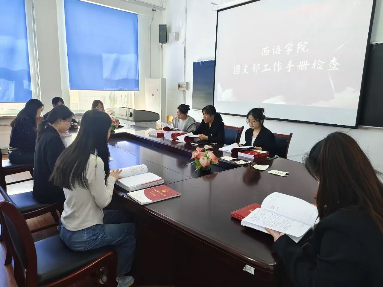 团委书记徐伟伟、学生兼职副书记和各部门部长于西语楼527进行《团支部工作手册》检查工作。