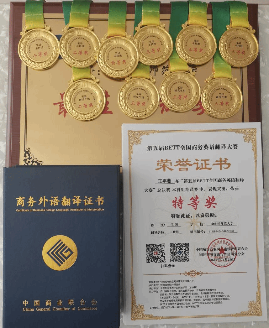 自2023年9月比赛开始到2024年4月比赛结束,大赛历时8个月。我校共有58名学生参与了大赛,每个阶段的比赛都取得了非常好的名次。总决赛结束后,笔译本科组方面1人获得了特等奖,奖金1000元,2人获得二等奖,奖金200元,还有3人获得了三等奖,研究生组1人获得了二等奖,3人获得了三等奖;口译方面,1人获得了大区赛特等奖。由于组织得力,我校还获得了“最佳组织奖”的荣誉证书,多名教师获得“优秀辅导教师”荣誉证书。