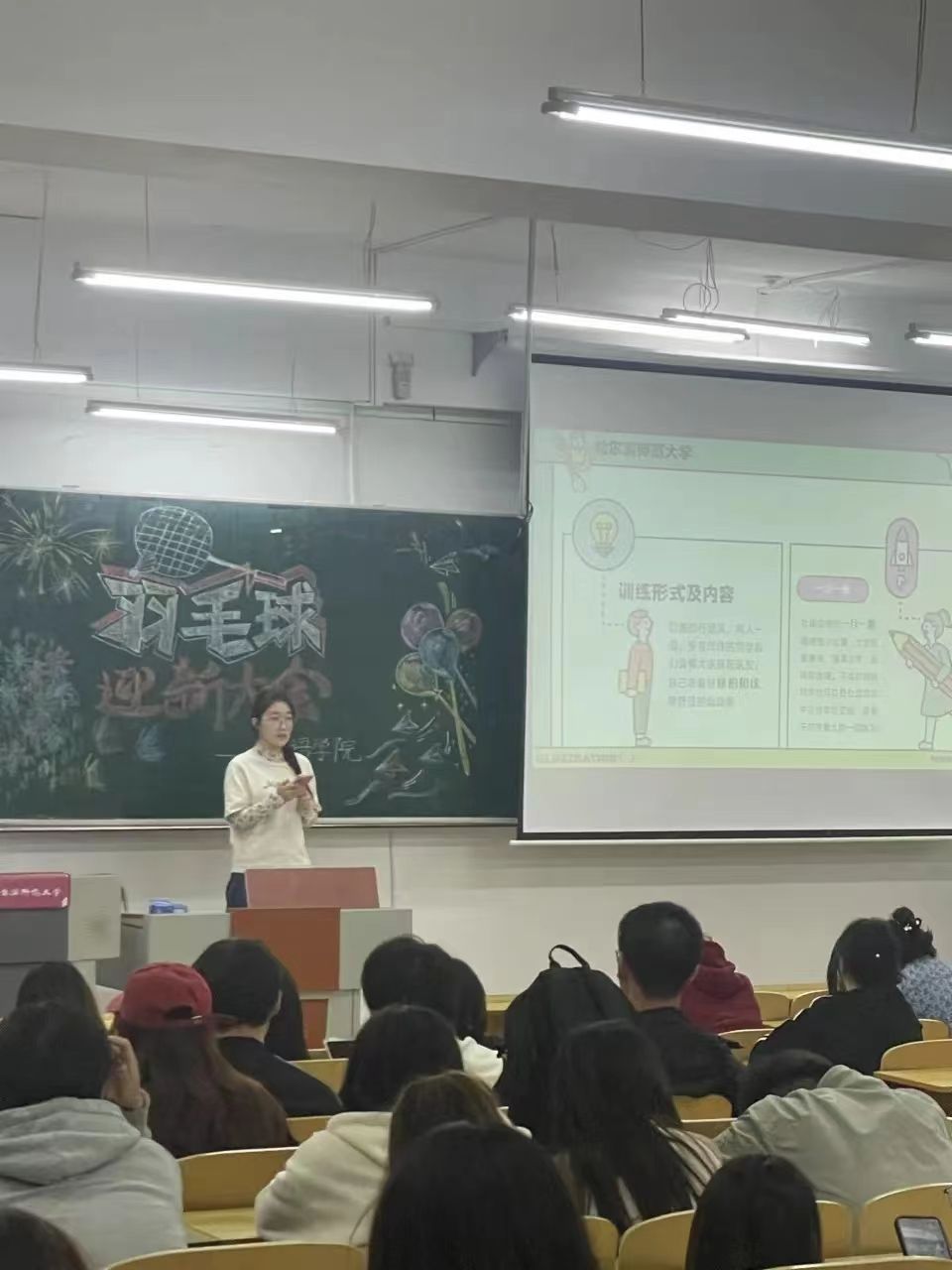 首先,副社长曾梓瑄向新社员们介绍了羽毛球社团的日常活动以及部门组成等基本内容,分别概述了社团部门办公室、宣传部和管理部的职能,让各位成员对社团有了初步的了解。而后,她鼓励新社员积极参与部门选拔面试,为羽毛球社的建设添砖加瓦。