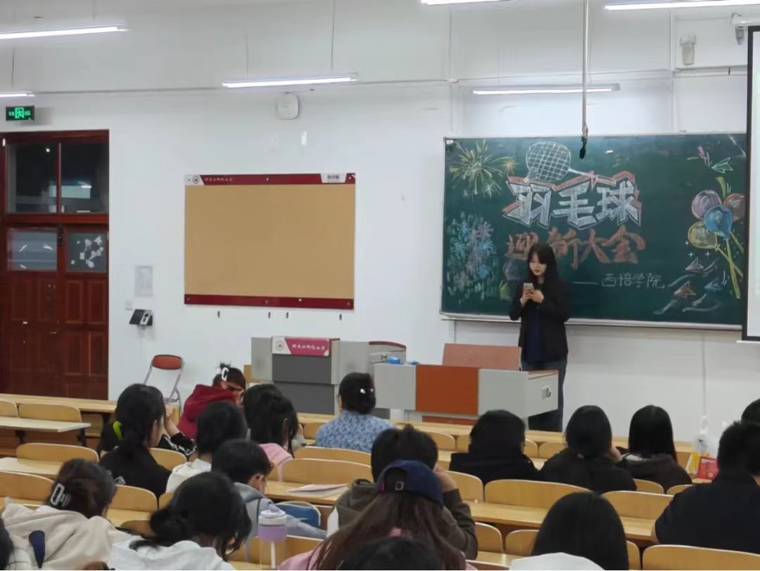 团委成立了羽毛球社团,并于4月25日19时在西语楼451室举办了羽毛球社团首次见面会暨迎新大会,社长孙瑞、副社长曾梓瑄、吕姿慧及全体社团成员参加了此次见面会。