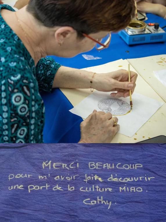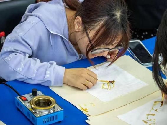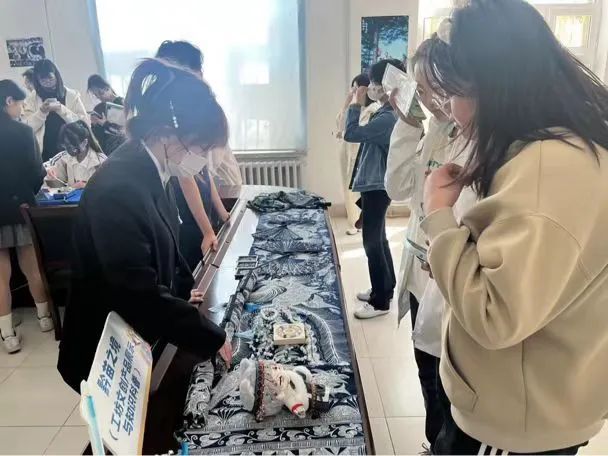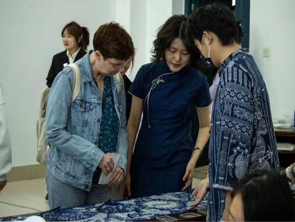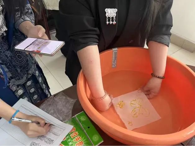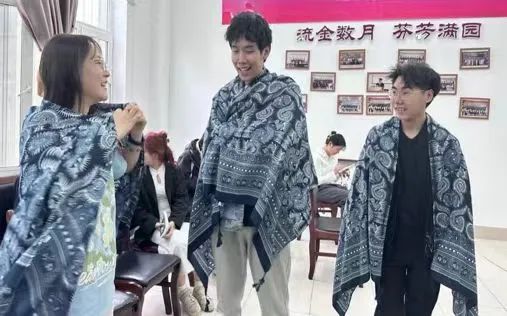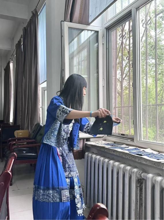 活动现场,经过专业培训的工作人员向参与者详细介绍了蜡染的历史背景和制作方法,并亲自示范了蜡染的基本步骤。参与者在工作人员的指导下,亲手操作,将蜡涂抹在布料上,然后按照指示进行蓝染。在这个过程中,他们不仅能够体验到蜡染的乐趣,还能在完成作品后,留下属于自己的独特记忆。辅导员老师也加入了这场蜡染的盛宴,披上民族服饰,共同迎接蜡染的璀璨明天。