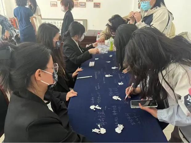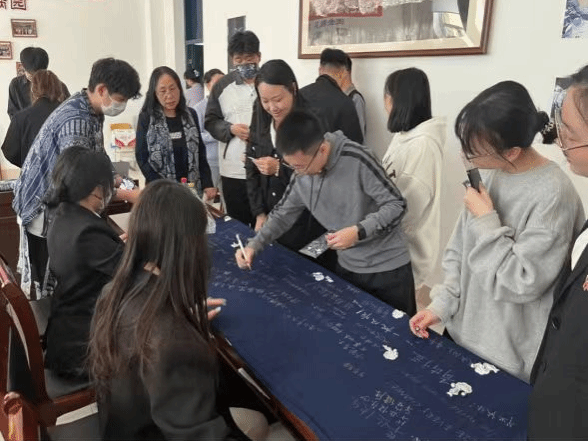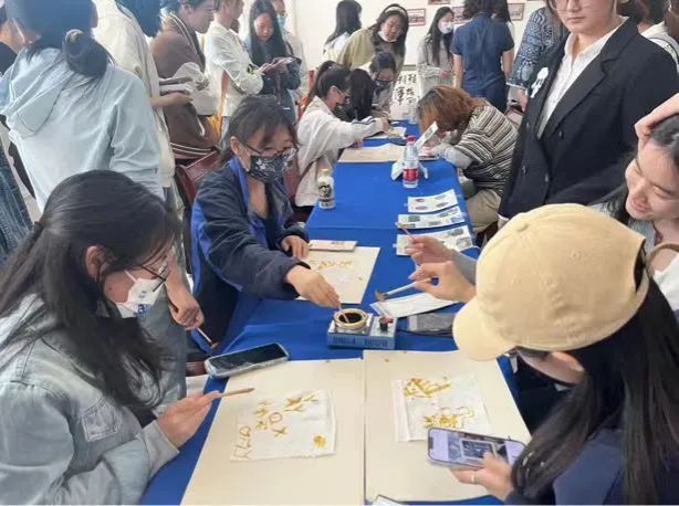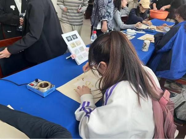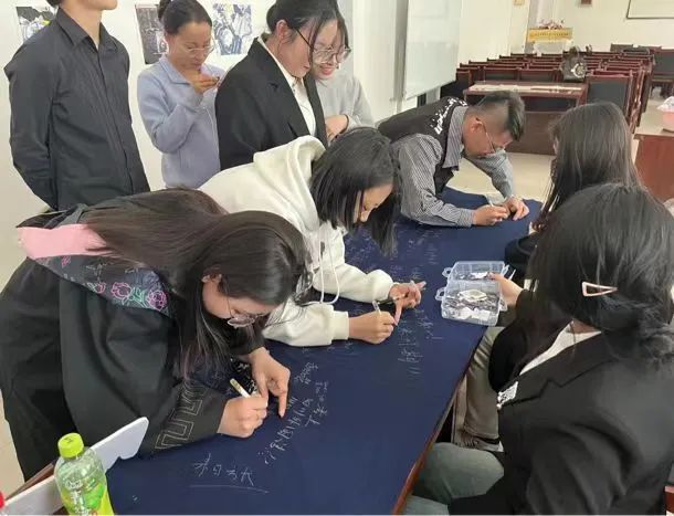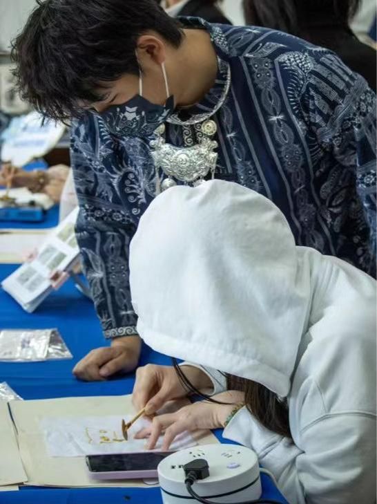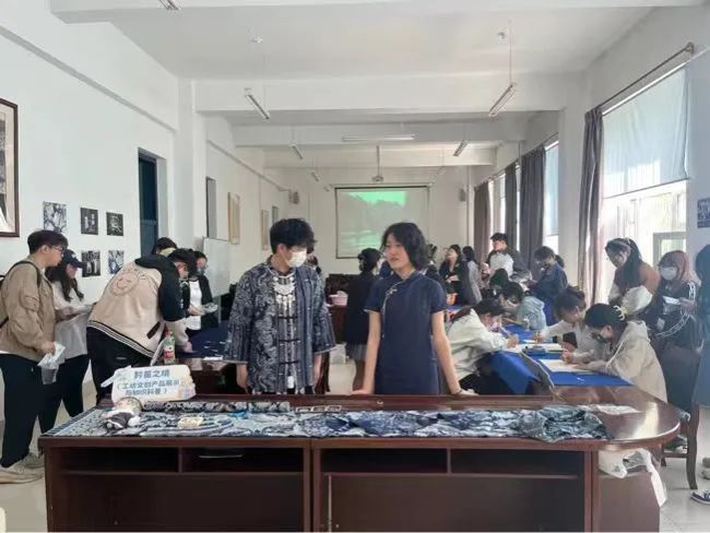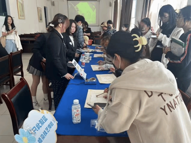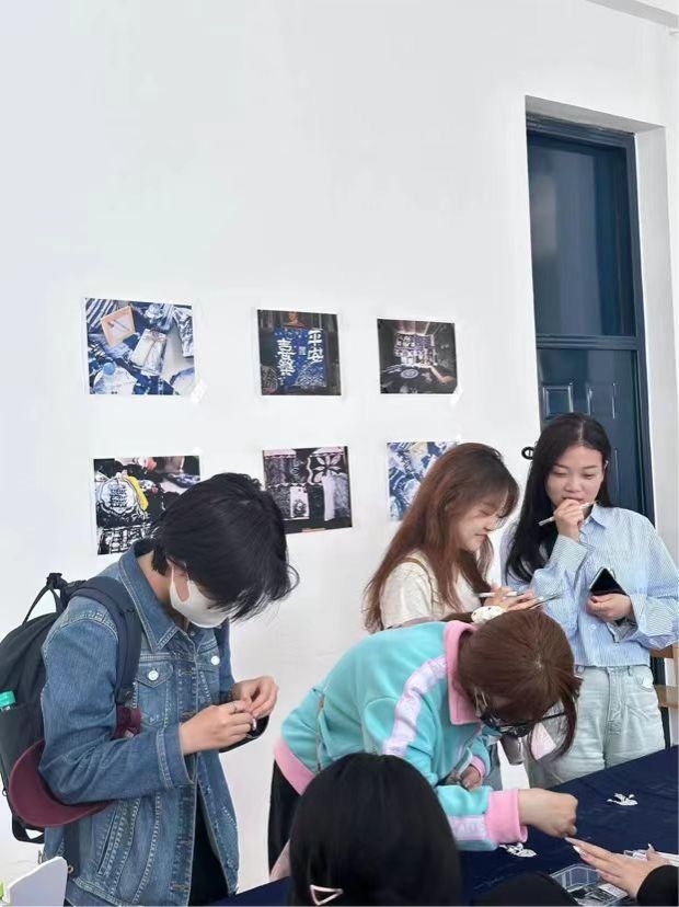 此次蜡染体验活动,旨在让参与者亲身体验蜡染的制作过程,感受这一传统技艺的魅力。本次活动设有黔苗之境(工坊文创产品展示与知识科普)、只此靛蓝(蜡染技艺体验)、同蜡共语(礼品领取与留言)三个板块,工作人员们化身引领者,潜入深蓝,希望能让前来体验的同学踏上一次别开生面的文化之旅。活动中,同学们热情高涨,纷纷加入到蜡染体验的行列中。