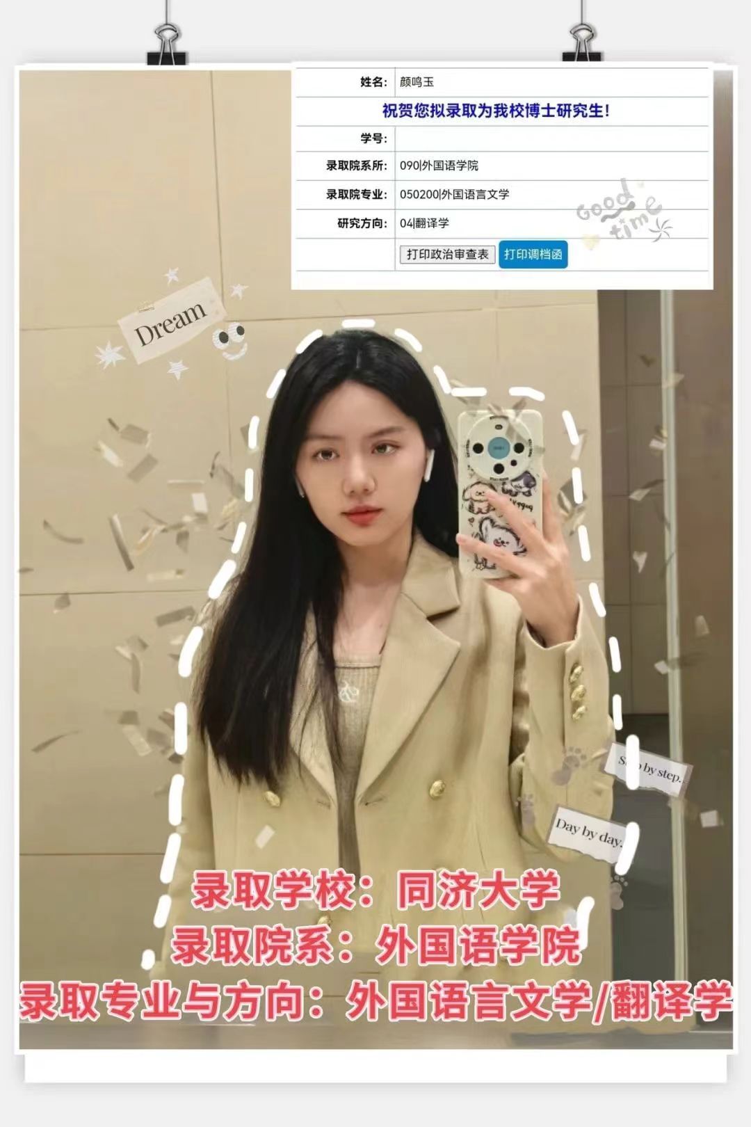 硕士研究生博士录取3人。22级英语笔译专业颜鸣玉考入同济大学外国语学院攻读外国语言文学专业翻译学方向博士;iqqtv