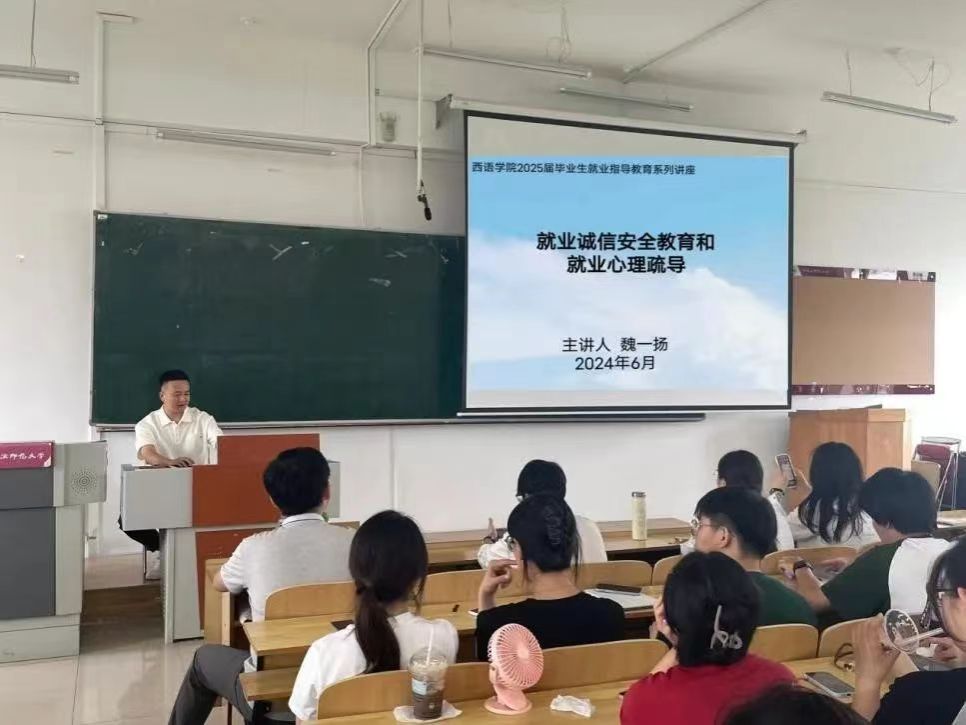 于2024年6月20日召开2025届毕业生就业诚信安全教育和就业心理辅导讲座。本次讲座由2025届毕业生辅导员杨晓明、张欣桐、魏一扬主讲,全体2025届毕业生参加讲座。