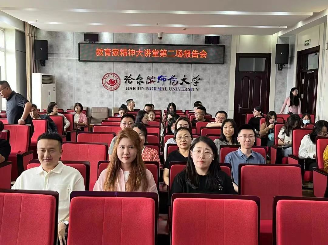 领导班子成员、全体行政人员及学生代表于西语楼204观看黑龙江省“教育家精神大讲堂”第二场报告会直播,教师代表于行知楼746观看直播。