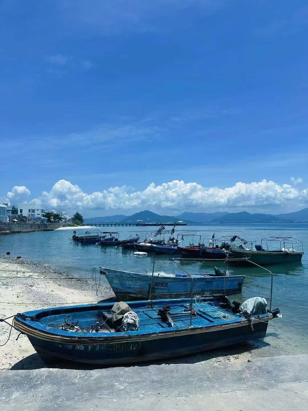 几艘斑驳渔船静静地停靠在沙滩上。它们的色彩与周围的环境和谐地融合在一起,仿佛是大自然的一部分。远处的山峦和天空构成了一幅美丽的背景,让人感到宁静和安详。这些小船虽然简陋,但却充满了生活的气息和历史的痕迹。它们见证了数辈渔民们的辛勤劳作也承载了他们对大海的热爱和敬畏。“野渡无人舟自横”,这不仅是对自然景色的描绘,也是对人生真谛的表达。只有放下心中的执着和欲望时,才能真正体验到生命的美好和自由。