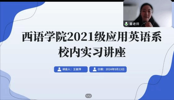 2024年9月3日,首场翻译方向外聘专家实习指导讲座在西语楼403顺利召开,同时在腾讯会议为未返校的同学进行同步直播,本场讲座由iqqtv