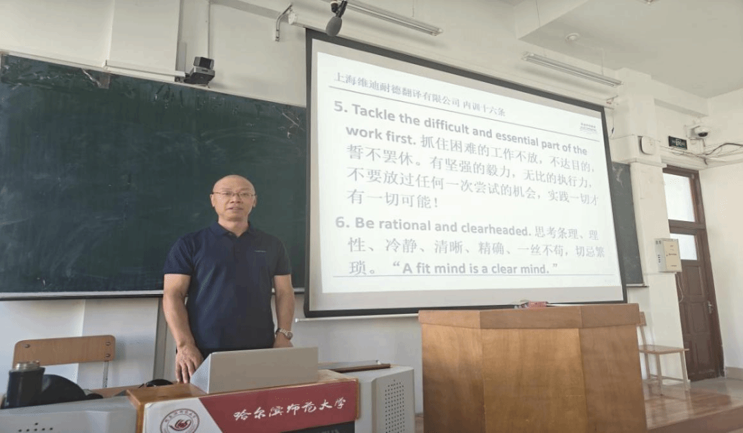 讲座伊始,董文君老师简要介绍了黑龙江译者翻译服务有限公司的背景渊源、技术资质以及主讲人闫洪伟经理的概况,为同学们铺垫了讲座的基础背景。