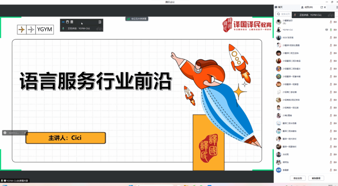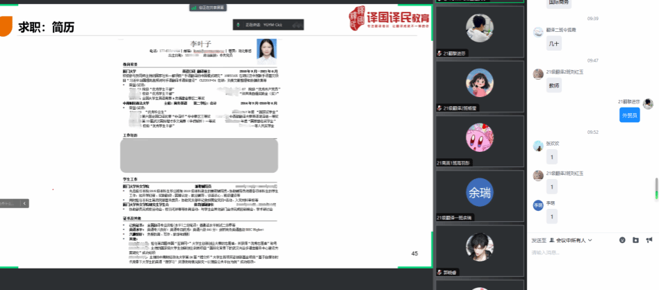 为了进一步让学生了解实习要求,切实体会成为一名译员和一名语言工作者需要什么样的素质和能力,明确未来就业方向,2024年9月11日上午9:00-11:00通过腾讯会议平台(会议号;59789461826)线上举办了翻译专业和商务英语专业第八次实习讲座,本次会议由福州实习队队长21级翻译2班黎进莎主持,特邀福州译国译民教育集团(译国译民翻译公司)专家、金牌讲师李叶子(Cici)老师进行讲授,翻译专业及商务英语专业全体学生参会。
