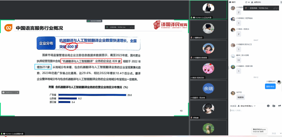 会议伊始,李老师先提到中国语言服务行业发展虽然相较其他国家起步较晚,但随着我国综合国力的增强以及对外传播中国文化的需要,近年来,中国翻译及语言服务行业产值保持良好增长态势,机器翻译与人工智能翻译企业数量快速增长,这为我们专业学生带来了挑战但也带来了许多机遇,随着AI技术在语言服务领域的广泛应用,翻译的准确性和效率得到了显著提升。AI翻译工具能够在几秒钟内完成大量的文本翻译,这对于紧急项目和需要快速响应的任务来说是一个显著的优势。此外,AI还能够处理多种语言之间的翻译,打破了语言壁垒,促进了全球化交流。