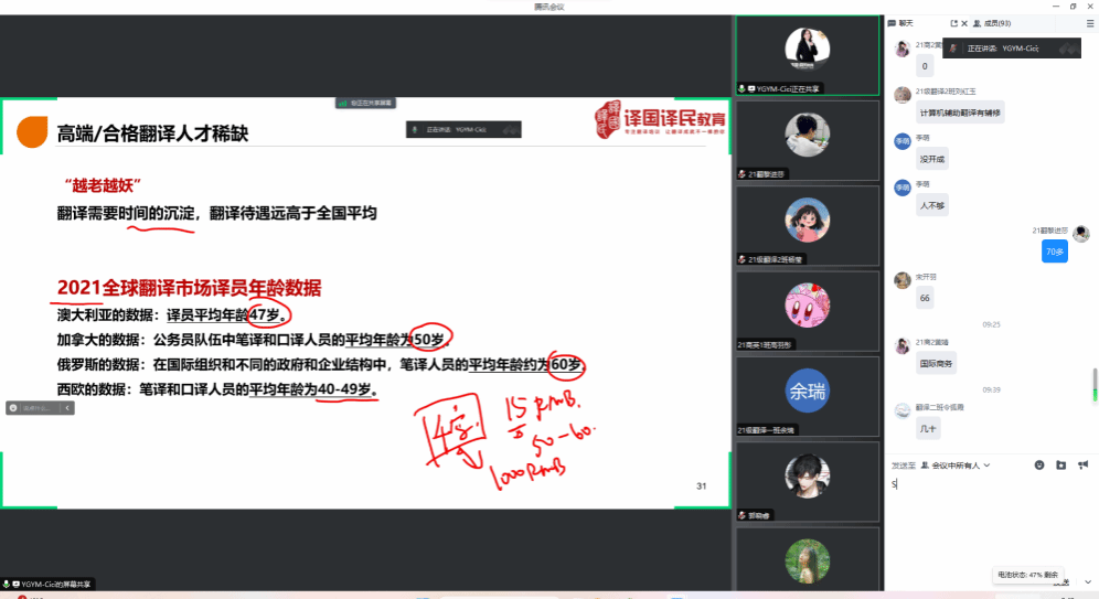 接着李叶子老师提到中国翻译教育前景,目前我国翻译行业人员平均工资水平在7000元以上,高端/合格的翻译人才仍然处于稀缺状态,做翻译需要时间和资历的沉淀,学生不必提前焦虑,按照社会趋势,不断增强自身本领,加强自身能力,等待机遇,前途一片光明。