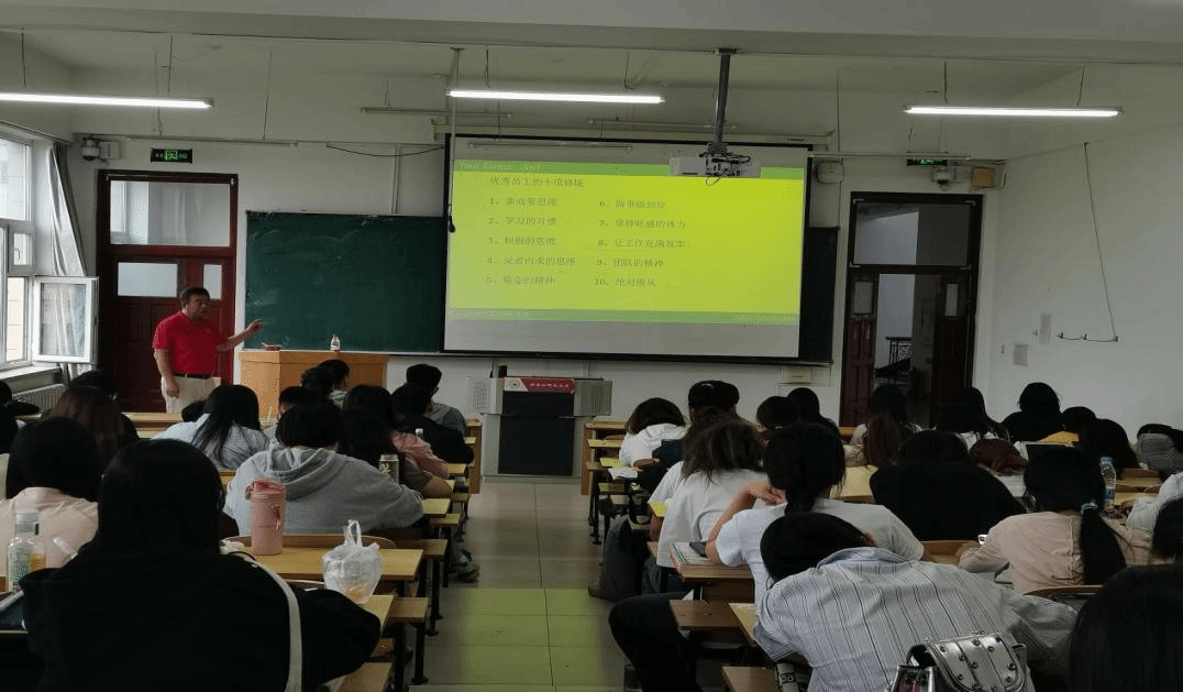 随后,闫国富先生详细阐述了商务英语专业的就业前景及发展趋势。他强调,优秀的企业品质应该具备“造”,“略”,“法”,“术”,“器”等要求,同时也讲述了自己的亲身经历,鼓励学生们在求职过程中勇于挑战自我,争取更多的就业机会。