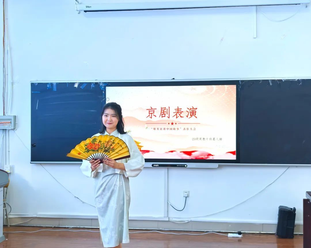 随后,为了让现场观众更加深入感受中华文化的魅力,23级英教10班葛人赫同学带来了京剧选段《梨花颂》;穿越岁月的风霜,凝望那些镌刻在时光深处的辉煌记忆,这一曲让我们感受到了庚续传承的东方美学,更让我们看见了新时代青年对传统文化的继承与发扬。